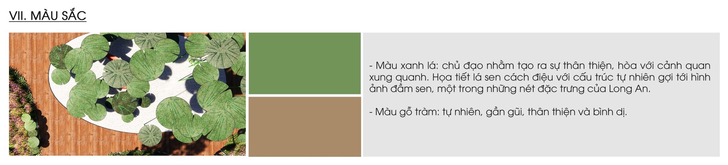 Màu xanh lá: chủ đạo nhằm tạo ra sự thân thiện, hòa với cảnh quan xung quanh. Họa tiết lá sen cách điệu với cấu trúc tự nhiên gợi tới hình ảnh đầm sen, một trong những nét đặc trưng của Long An.