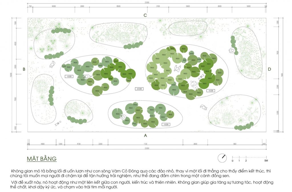 Không gian mô tả bằng lối đi uốn lượn như con sông Vàm Cỏ Đông qua các đảo nhỏ, thay vì một lối đi thẳng cho thấy điểm kết thúc, thì chúng tôi muốn mọi người đi chậm lại để tận hưởng trải nghiệm, như thể đang đắm chìm trong một cánh đồng sen.