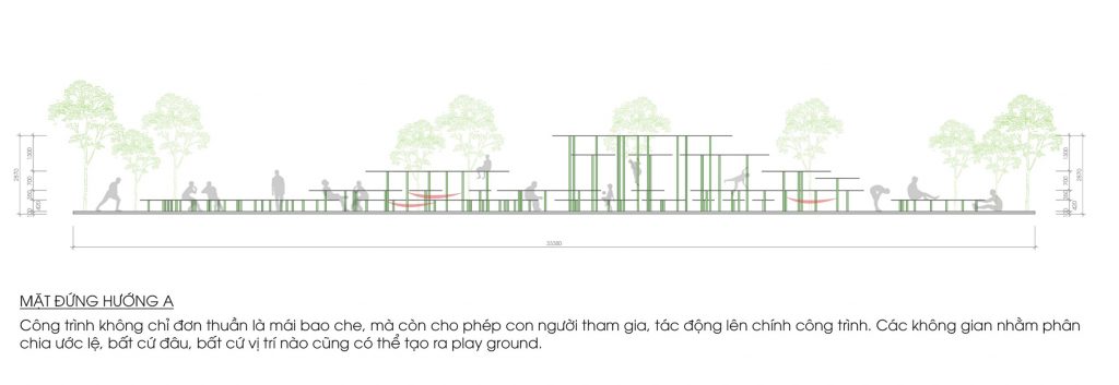 Công trình không chỉ đơn thuần là mái bao che, mà cho phép con người tham gia, tác động lên chính công trình. Các không gian nhằm phân chia ước lệ, bất cứ đâu, bất cứ vị trí nào cũng có thể tạo ra play ground.