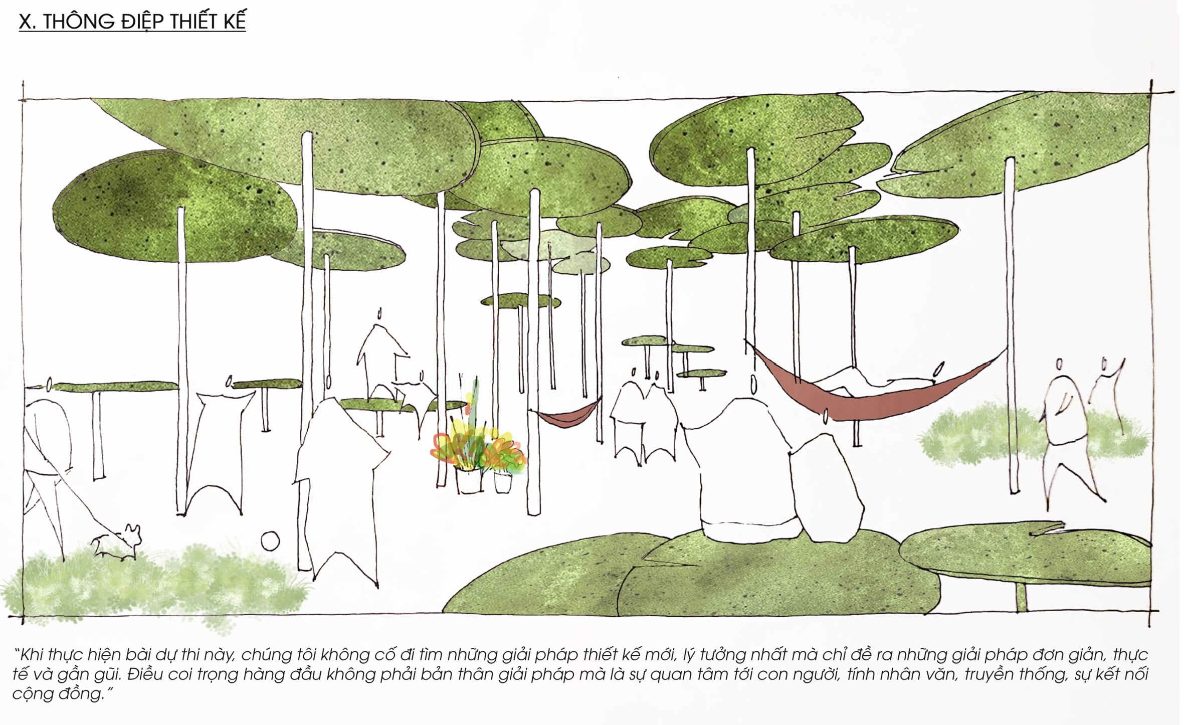 “Khi thực hiện bài dự thi này, chúng tôi không cố đi tìm những giải pháp thiết kế mới, lý tưởng nhất mà chỉ đề ra những giải pháp đơn giản, thực tế và gần gũi. Điều coi trọng hàng đầu không phải bản thân giải pháp mà là sự quan tâm tới con người, tính nhân văn, truyền thống, sự kết nối cộng đồng”.