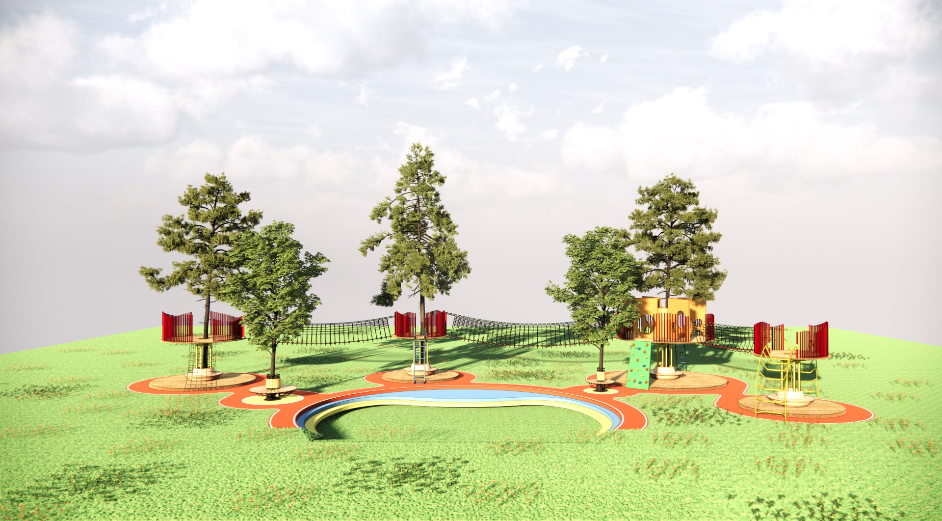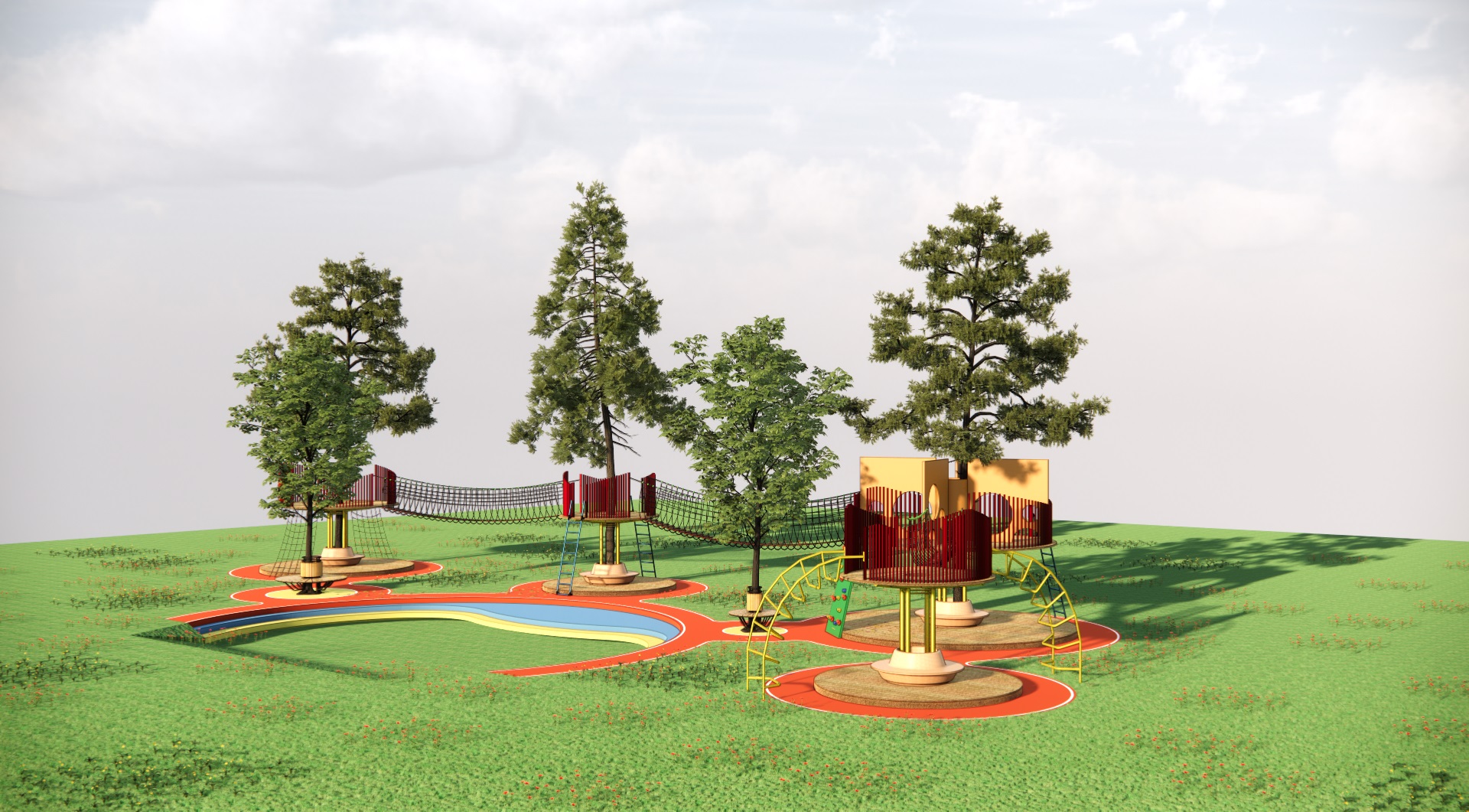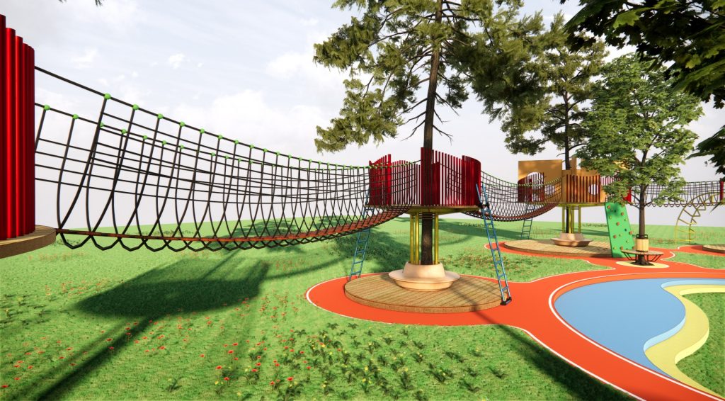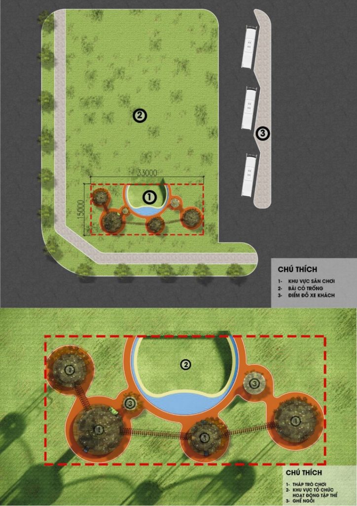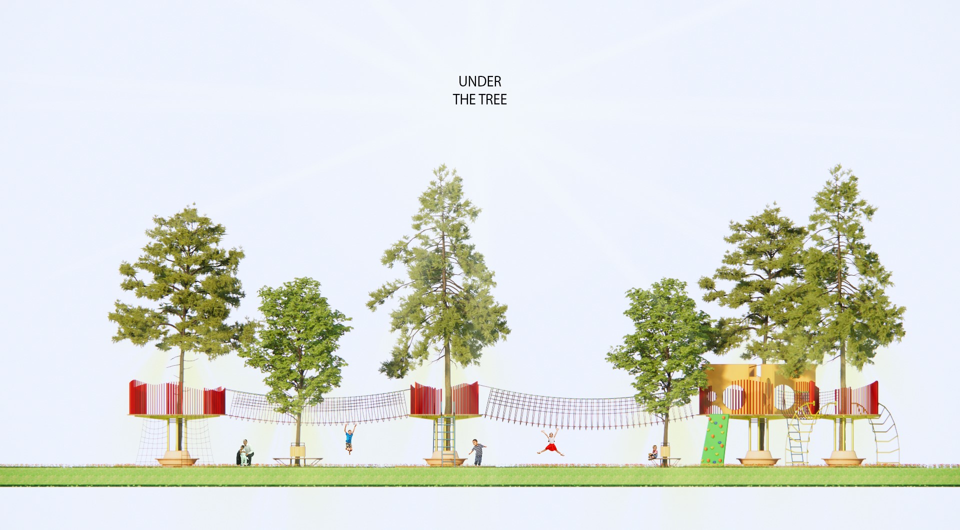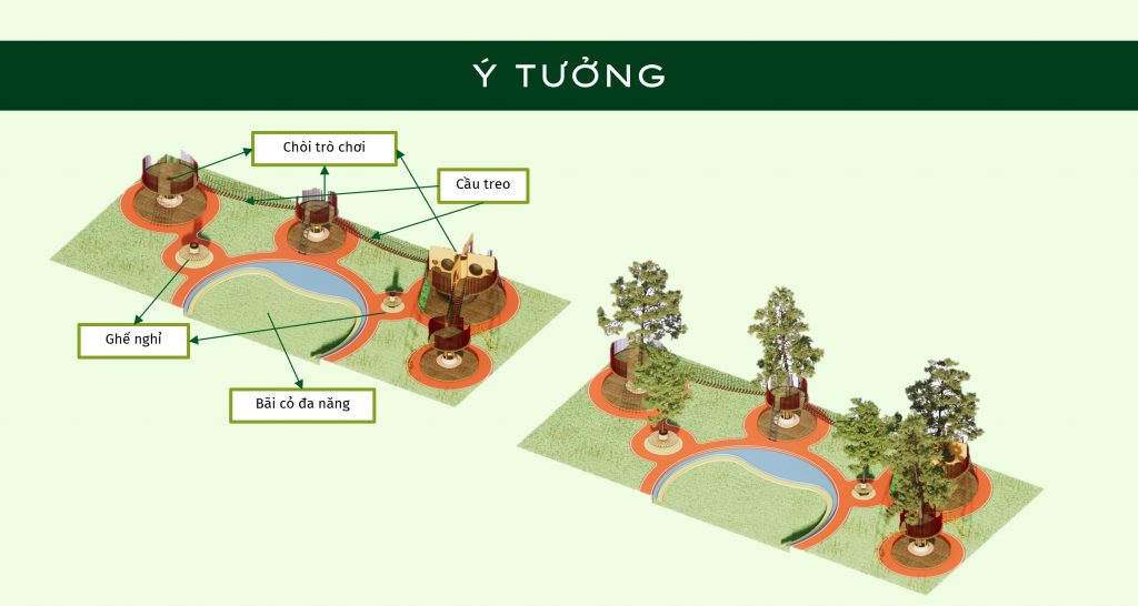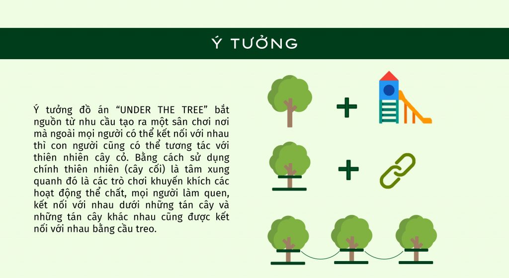 Ý tưởng đồ án “UNDER THE TREE” bắt nguồn từ nhu cầu tạo ra một sân chơi nơi mà ngoài mọi người có thể kết nối với nhau thì con người cũng có thể tương tác với thiên nhiên cây cỏ. Bằng cách sử dụng chính thiên nhiên (cây cối) là tâm xung quanh đó là các trò chơi khuyến khích các hoạt động thể chất, mọi người làm quen, kết nối với nhau dưới những tán cây và những tán cây khác nhau cũng được kết nối với nhau bằng cầu treo.