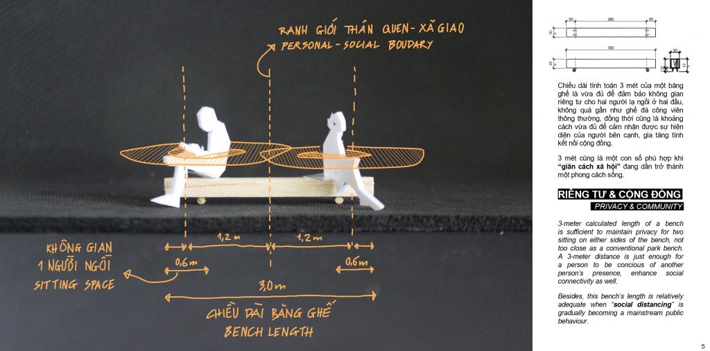 Chiều dài tính toán 3 mét của một băng ghế là vừa đủ để đảm bảo không gian riêng tư cho hai người lạ ngồi ở hai đầu, không quá gần như ghế đá công viên thông thường, đồng thời cũng là khoảng cách vừa đủ để cảm nhận được sự hiện diện của người bên cạnh, gia tăng tính kết nối cộng đồng.