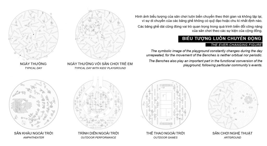 Hình ảnh biểu tượng của sân chơi luôn biến chuyển theo thời gian và không lặp lại, vì sự di chuyển của các băng ghế không có quỹ đạo hoặc chu kì nhất định nào.