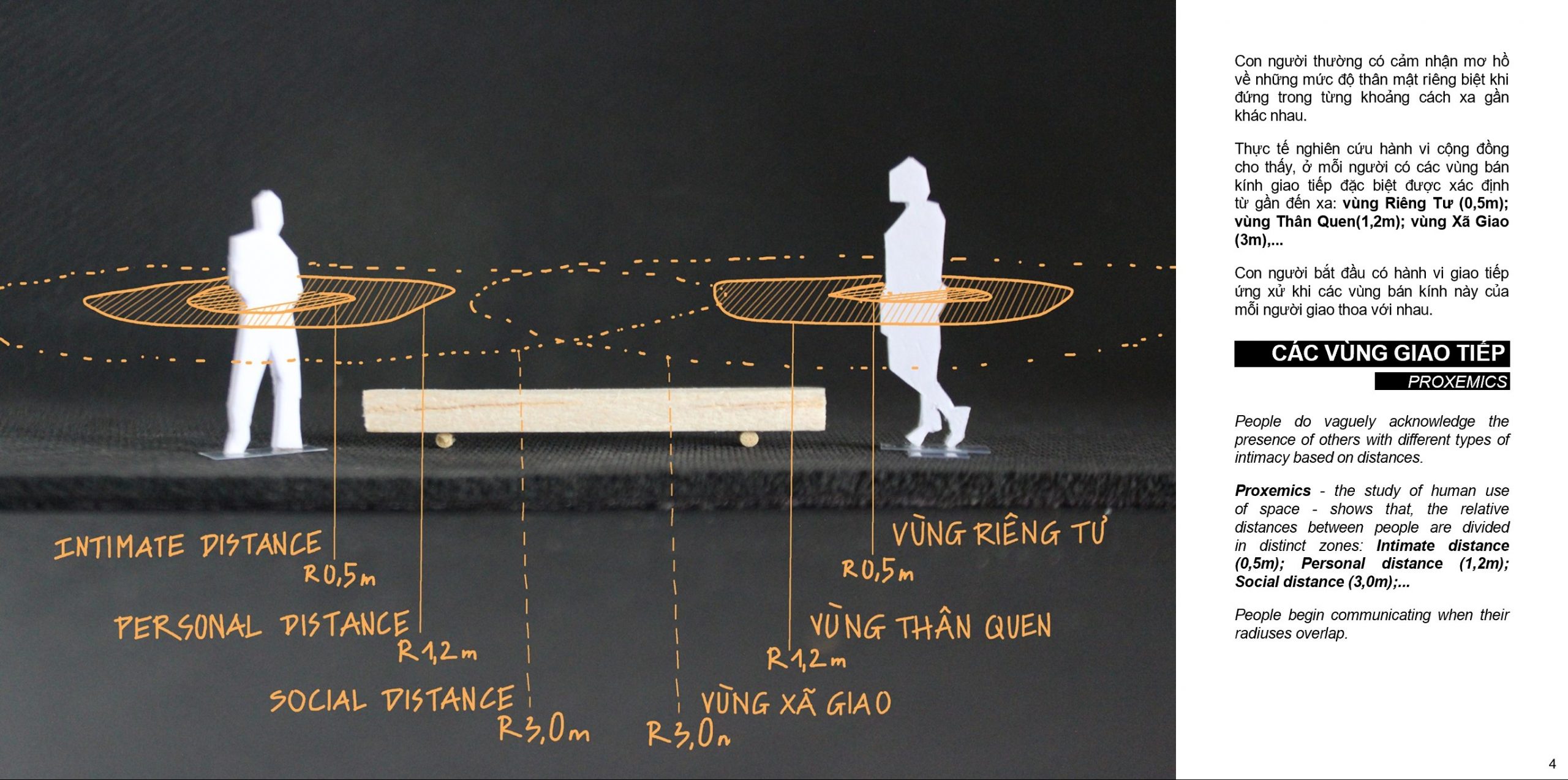 Thực tế nghiên cứu hành vi cộng đồng cho thấy, ở mỗi người có các vùng bán kính giao tiếp đặc biệt được xác định từ gần đến xa: vùng Riêng Tư (0,5m); vùng Thân Quen(1,2m); vùng Xã Giao (3m),…