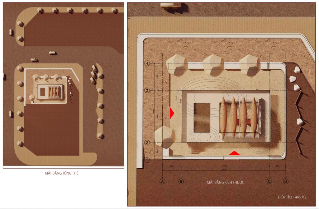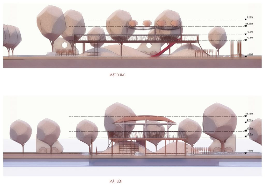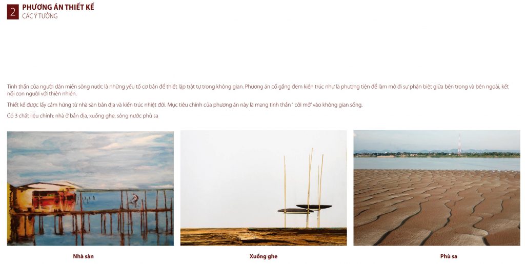 Thiết kế được lấy cảm hứng từ nhà sàn bản địa và kiến trúc nhiệt đới. Mục tiêu chính của phương án này là mang tinh thần “ cởi mở” vào không gian sống. Có 3 chất liệu chính: nhà ở bản địa, xuồng ghe, sông nước phù sa.