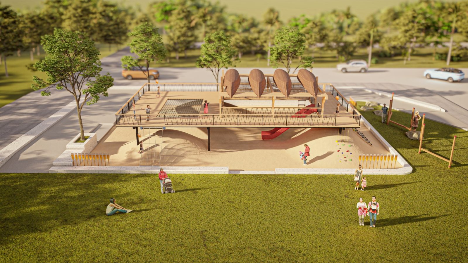 Để thiết lập không gian tổng thể. Các khu vui chơi được hình thành liên kết với kiến trúc bằng các khối hình học. Ngôn ngữ hình thức có nguồn góc từ các hình học cơ bản từ hình tròn, hình vuông và các đường thẳng, các thanh thép được sử dụng để cân bằng và tạo ra sự so le nhịp nhàng về độ cao. Để phù hợp với cách tiếp cận của thiết kế thời đó, đơn sơ mộc mạc mà cả cách phối màu cũng được chú trọng. Ý tưởng màu sắc ban đầu là màu nâu của phù sa, màu gỗ và xám của kết cấu chịu lực, đồi và đất nện không chỉ được phản ánh trong thiết bị sân chơi mà còn được tìm thấy đâu đó trong đời sống hằng ngày.