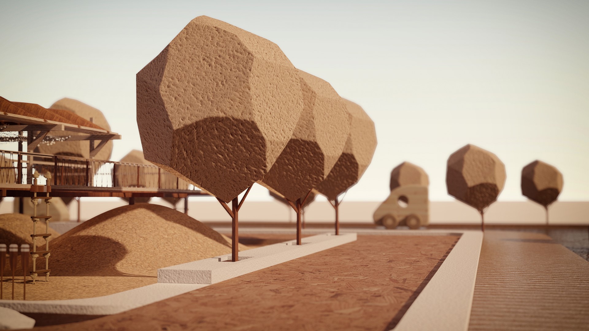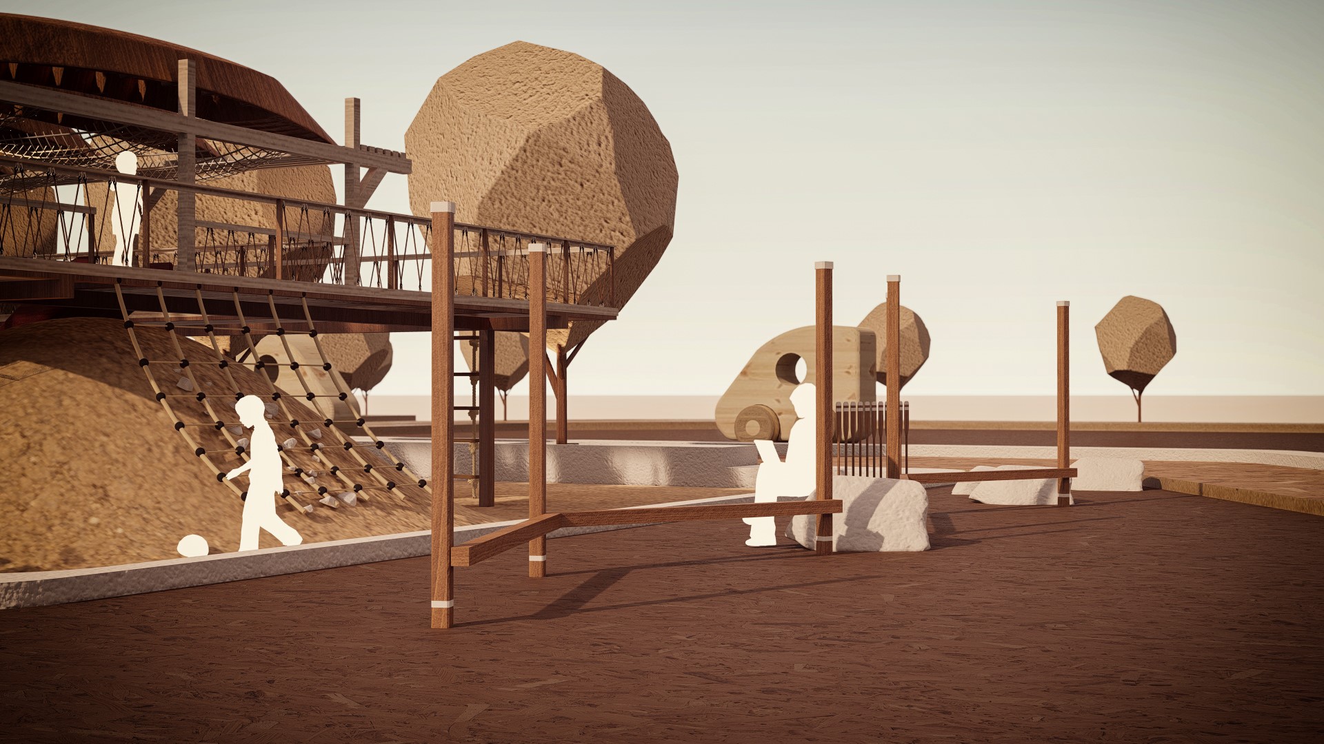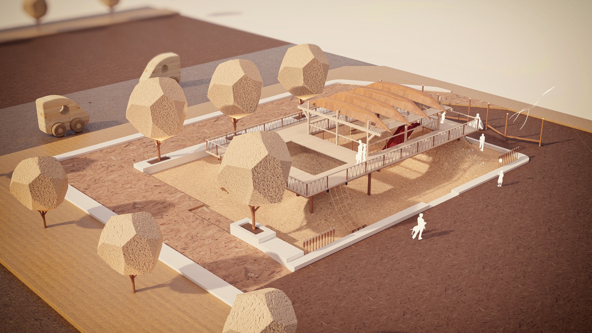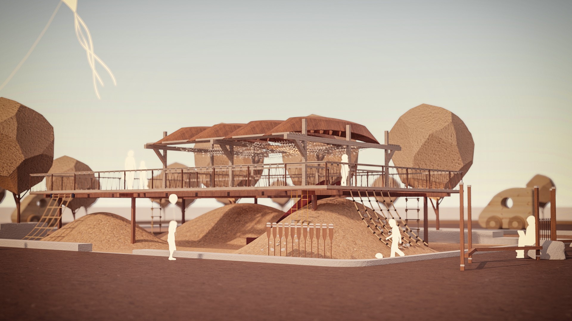 Để thiết lập không gian tổng thể. Các khu vui chơi được hình thành liên kết với kiến trúc bằng các khối hình học. Ngôn ngữ hình thức có nguồn góc từ các hình học cơ bản từ hình tròn, hình vuông và các đường thẳng, các thanh thép được sử dụng để cân bằng và tạo ra sự so le nhịp nhàng về độ cao. Để phù hợp với cách tiếp cận của thiết kế thời đó, đơn sơ mộc mạc mà cả cách phối màu cũng được chú trọng. Ý tưởng màu sắc ban đầu là màu nâu của phù sa, màu gỗ và xám của kết cấu chịu lực, đồi và đất nện không chỉ được phản ánh trong thiết bị sân chơi mà còn được tìm thấy đâu đó trong đời sống hằng ngày.