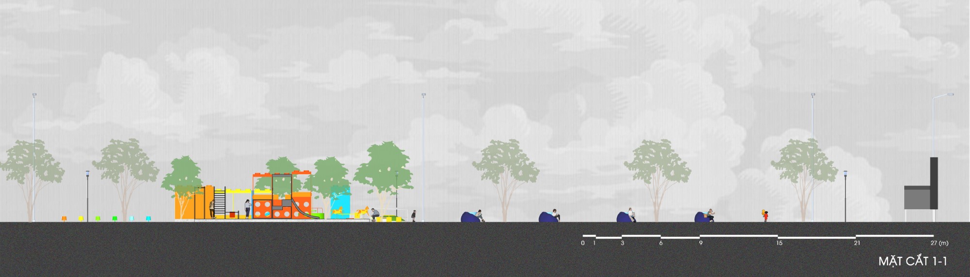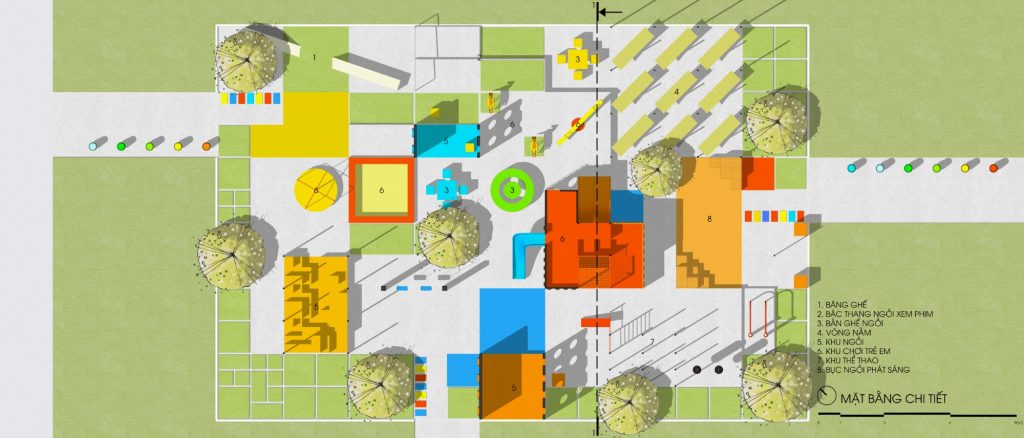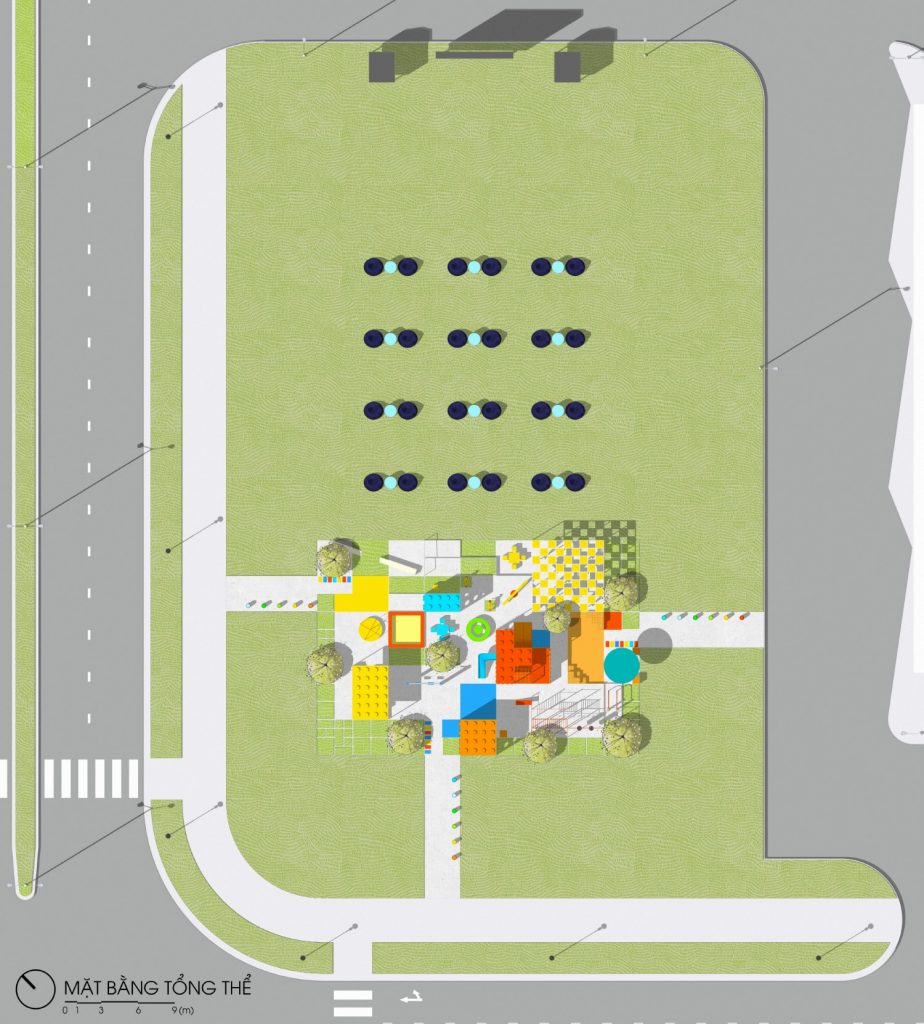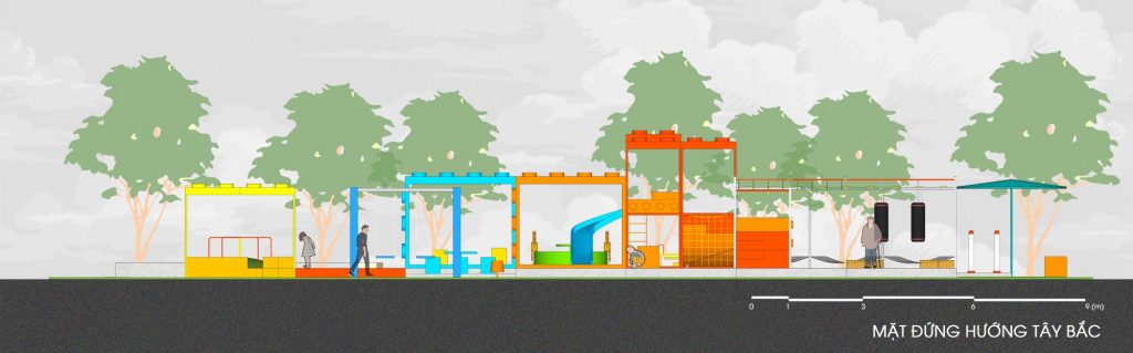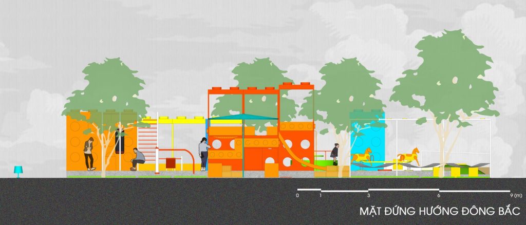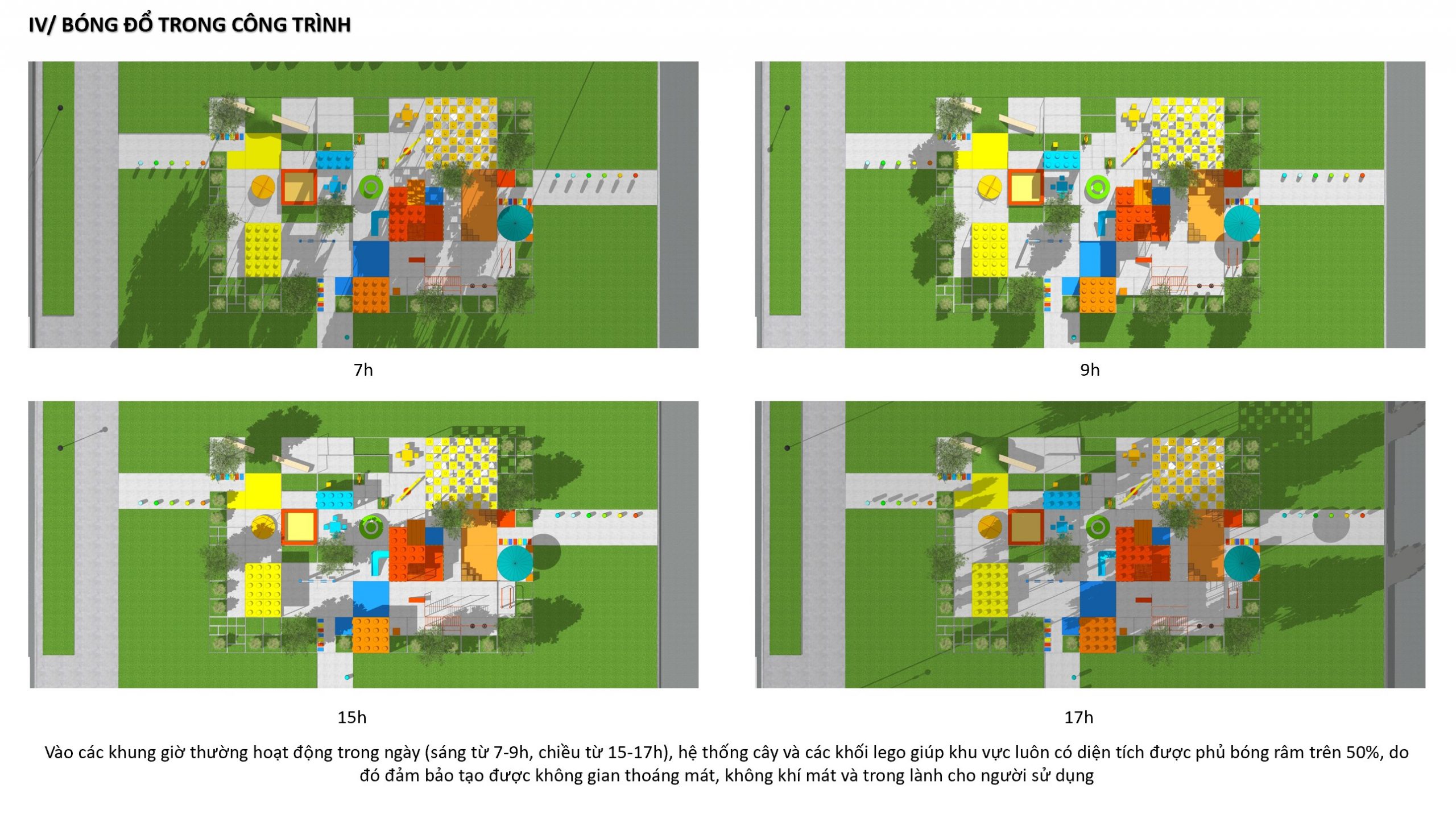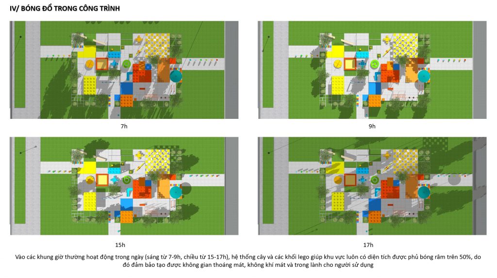 Vào các khung giờ thường hoạt động trong ngày (sáng từ 7-9h, chiều từ 15-17h), hệ thống cây và các khối lego giúp khu vực luôn có diện tích được phủ bóng râm trên 50%, do đó đảm bảo tạo được không gian thoáng mát, không khí mát và trong lành cho người sử dụng.