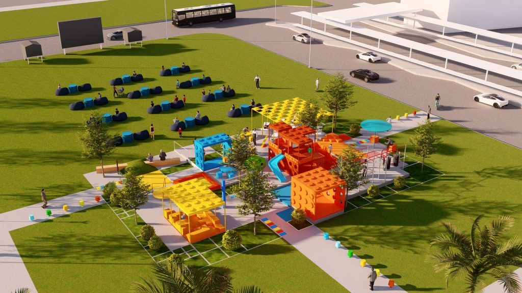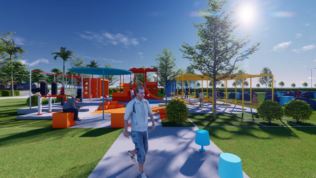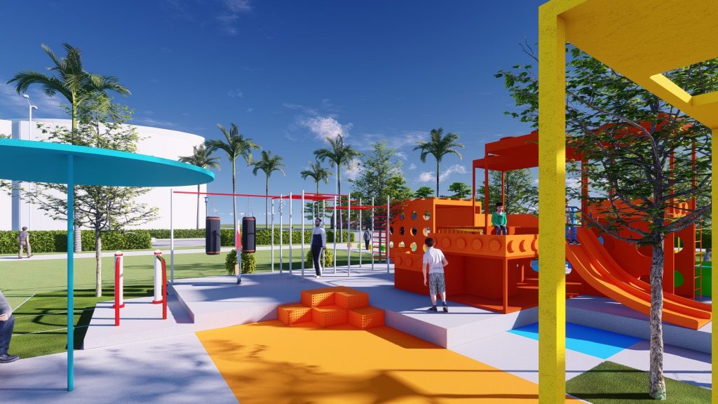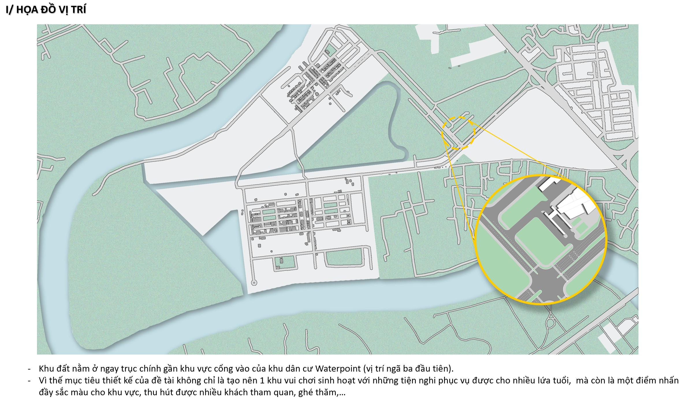 Khu đất nằm ở ngay trục chính gần khu vực cổng vào của khu dân cư Waterpoint (vị trí ngã ba đầu tiên). Vì thế mục tiêu thiết kế của đề tài không chỉ là tạo nên 1 khu vui chơi sinh hoạt với những tiện nghi phục vụ được cho nhiều lứa tuổi, mà còn là một điểm nhấn đầy sắc màu cho khu vực, thu hút được nhiều khách tham quan, ghé thăm.