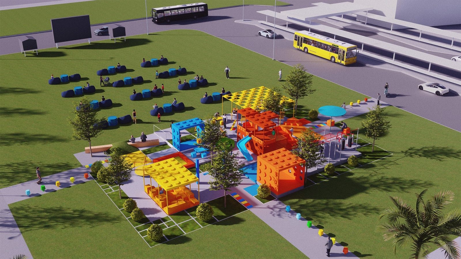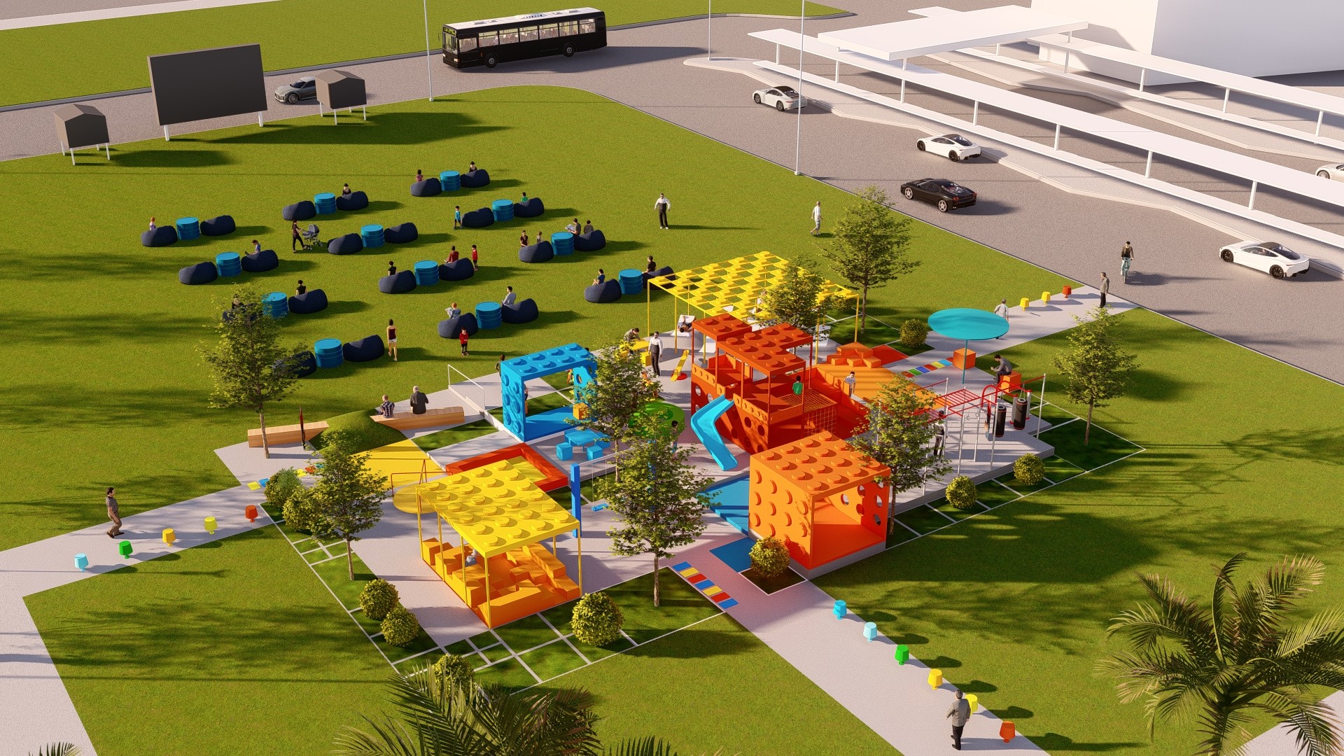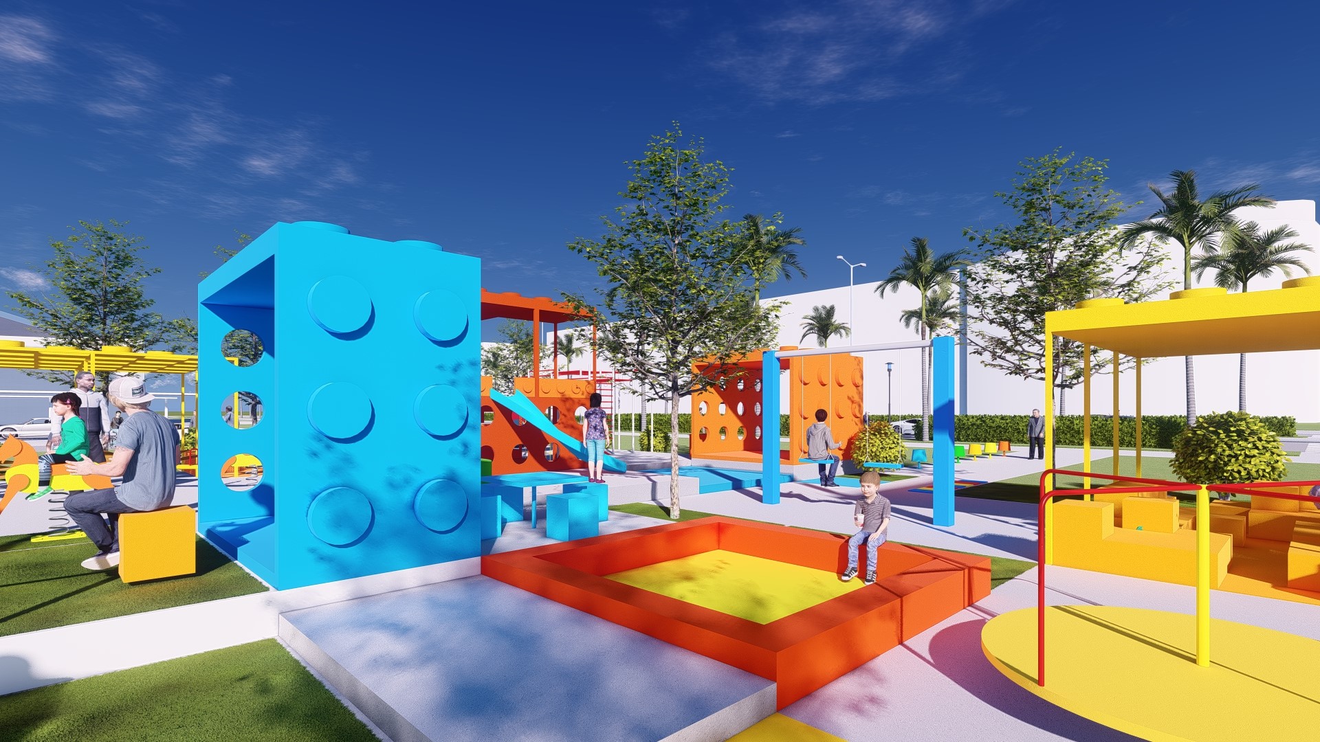 Đối với các khối lego cao, các gam màu nóng như đỏ, cam, vàng được sử dụng để tạo sự tương phản với nền trời (xanh biển) và các mảng cỏ (xanh lá). Mục đích chính là tạo điểm nhấn cho khu vui chơi vì các gam màu này dễ thu hút thị giác, tạo sự chú ý đối với người đi đường.