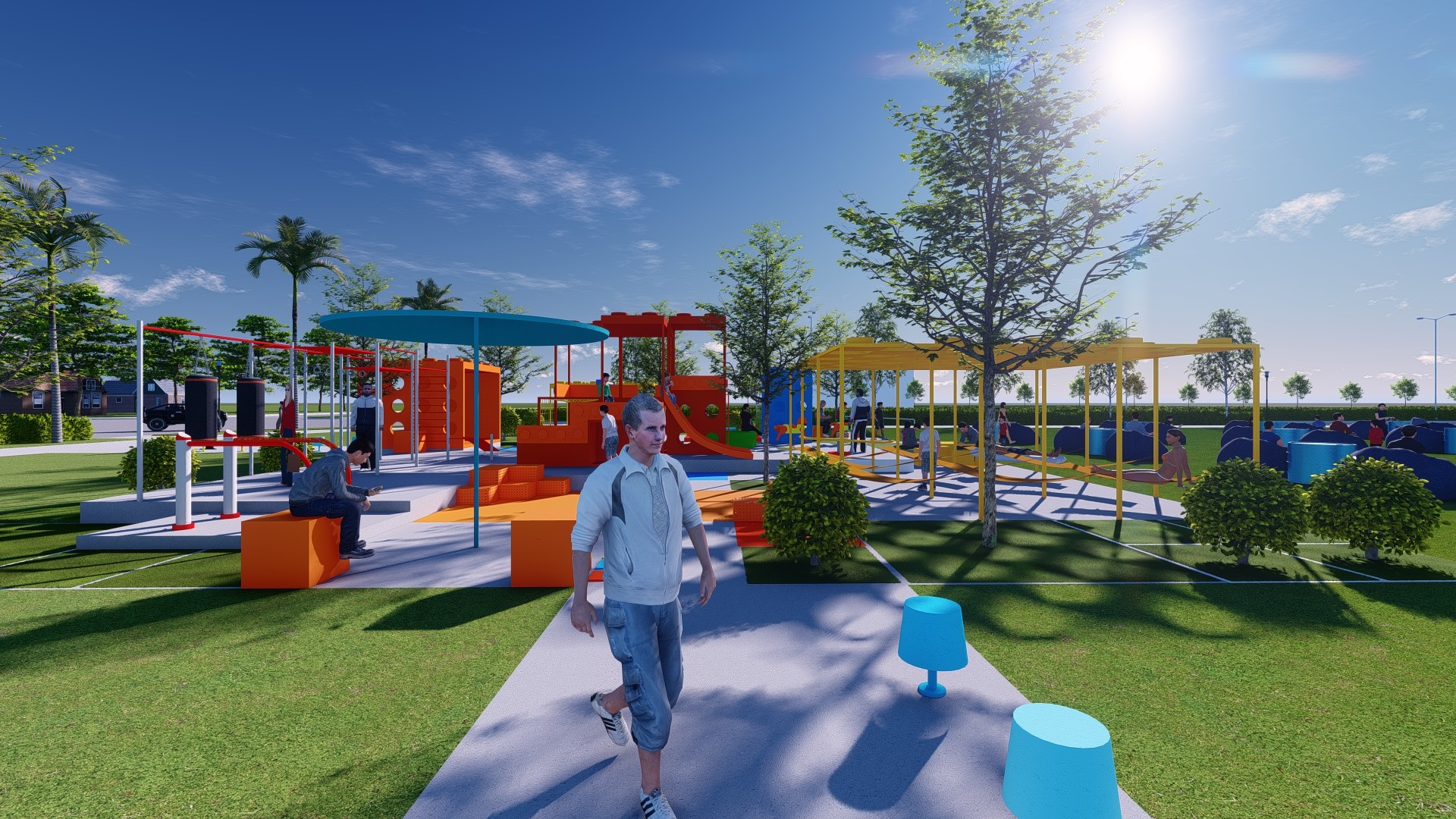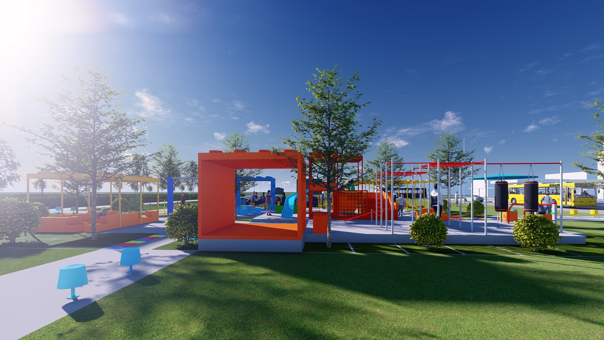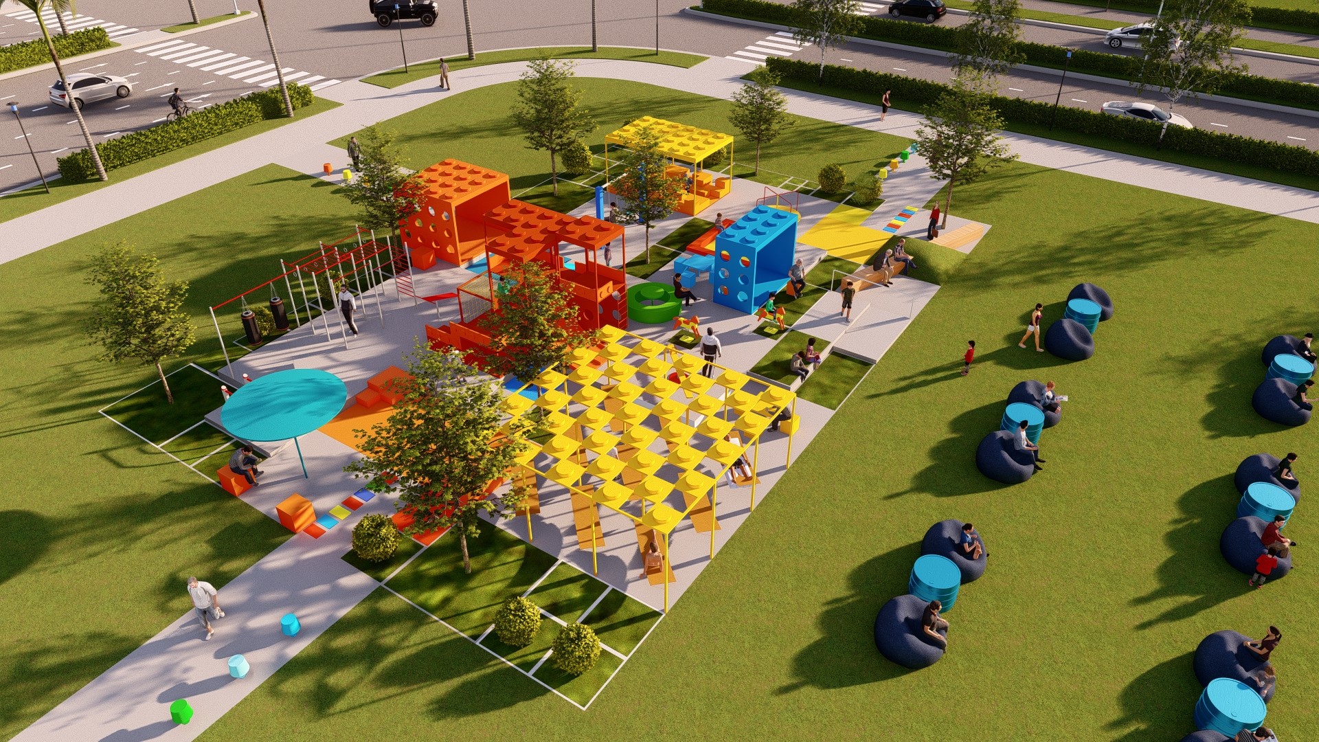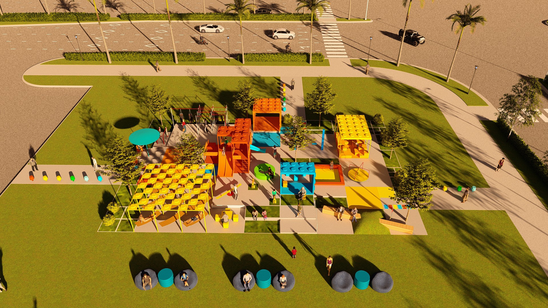 Đối với các khối lego cao, các gam màu nóng như đỏ, cam, vàng được sử dụng để tạo sự tương phản với nền trời (xanh biển) và các mảng cỏ (xanh lá). Mục đích chính là tạo điểm nhấn cho khu vui chơi vì các gam màu này dễ thu hút thị giác, tạo sự chú ý đối với người đi đường.