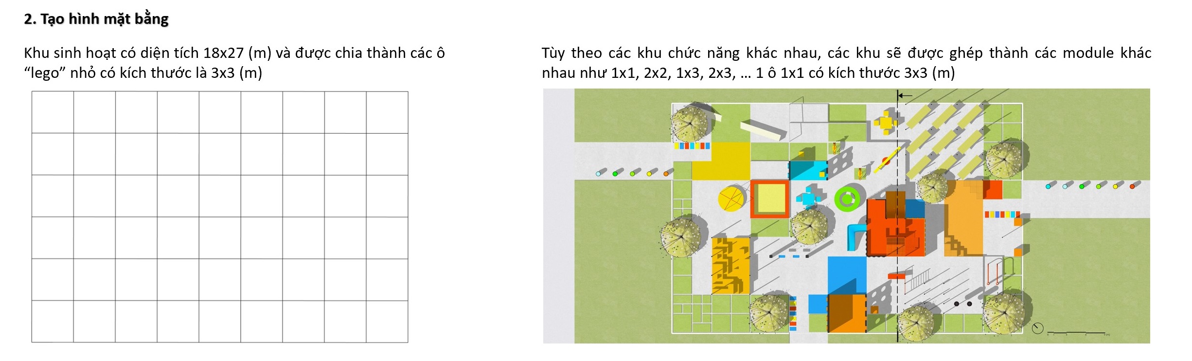 Khu sinh hoạt có diện tích 18×27 (m) và được chia thành các ô “lego” nhỏ có kích thước là 3×3 (m).