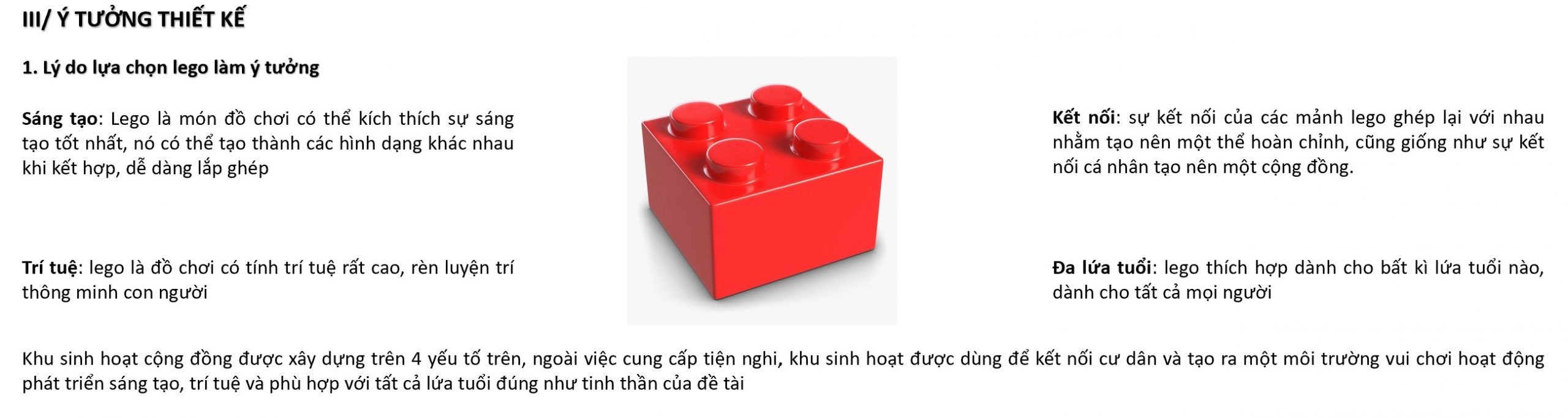 Khu sinh hoạt cộng đồng được xây dựng trên 4 yếu tố trên, ngoài việc cung cấp tiện nghi, khu sinh hoạt được dùng để kết nối cư dân và tạo ra một môi trường vui chơi hoạt động phát triển sáng tạo, trí tuệ và phù hợp với tất cả lứa tuổi đúng như tinh thần của đề tài.