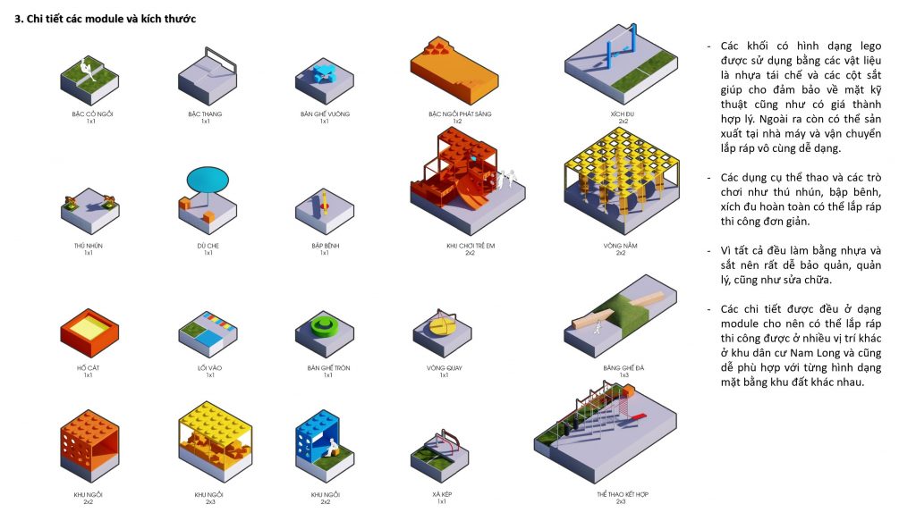 Tùy theo các khu chức năng khác nhau, các khu sẽ được ghép thành các module khác nhau như 1×1, 2×2, 1×3, 2×3, … 1 ô 1×1 có kích thước 3×3 (m).