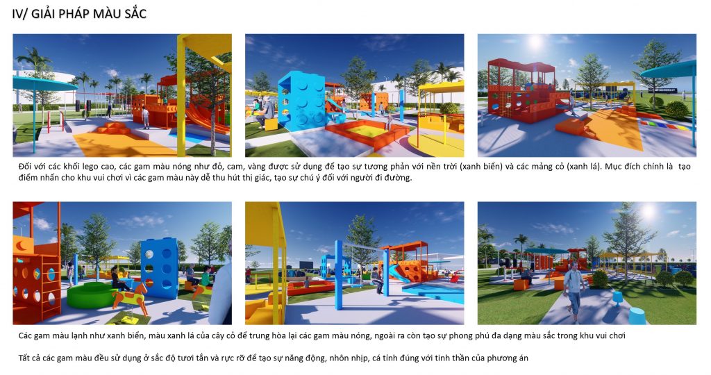 Các gam màu lạnh như xanh biển, màu xanh lá của cây cỏ để trung hòa lại các gam màu nóng, ngoài ra còn tạo sự phong phú đa dạng màu sắc trong khu vui chơi.