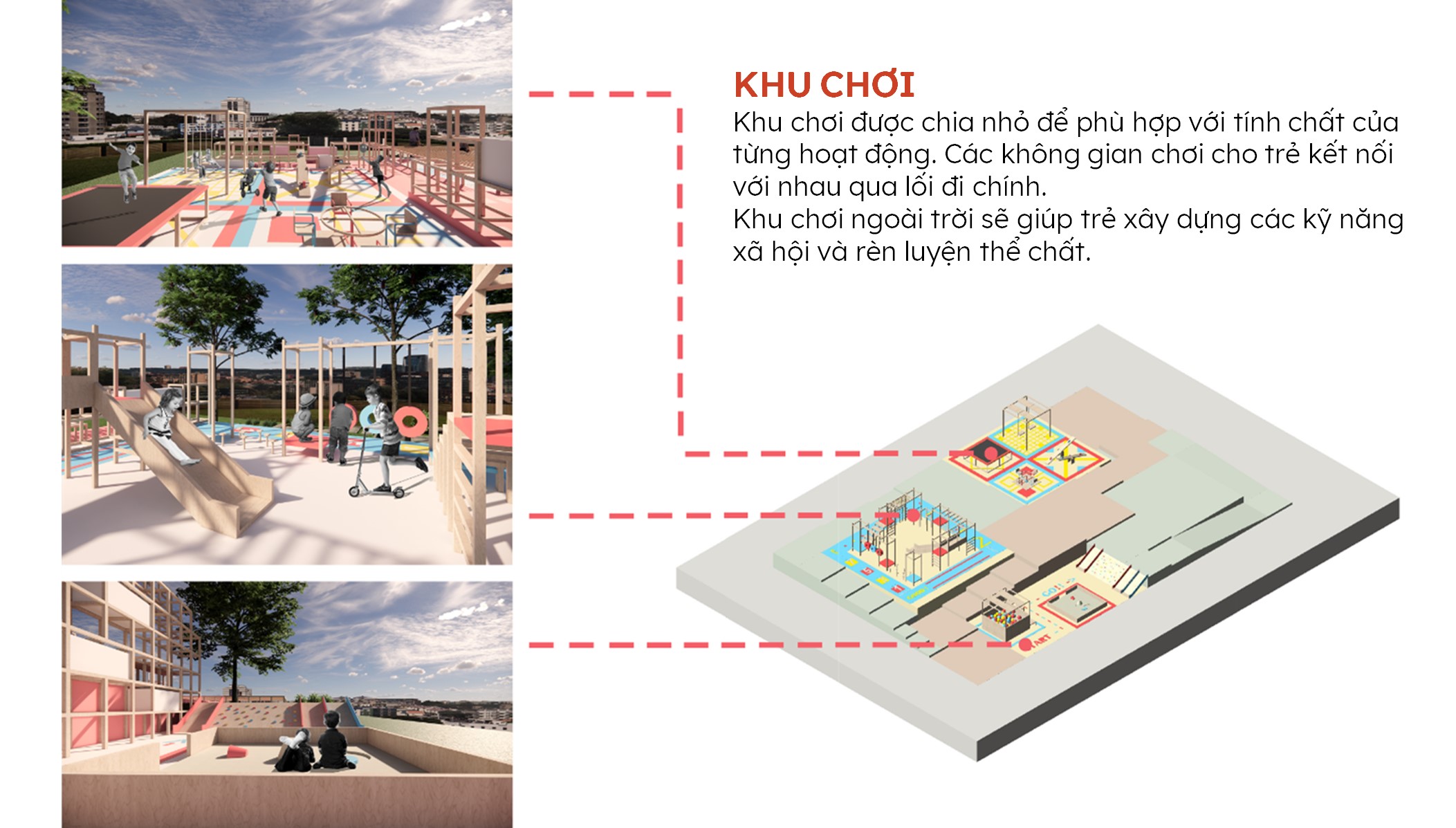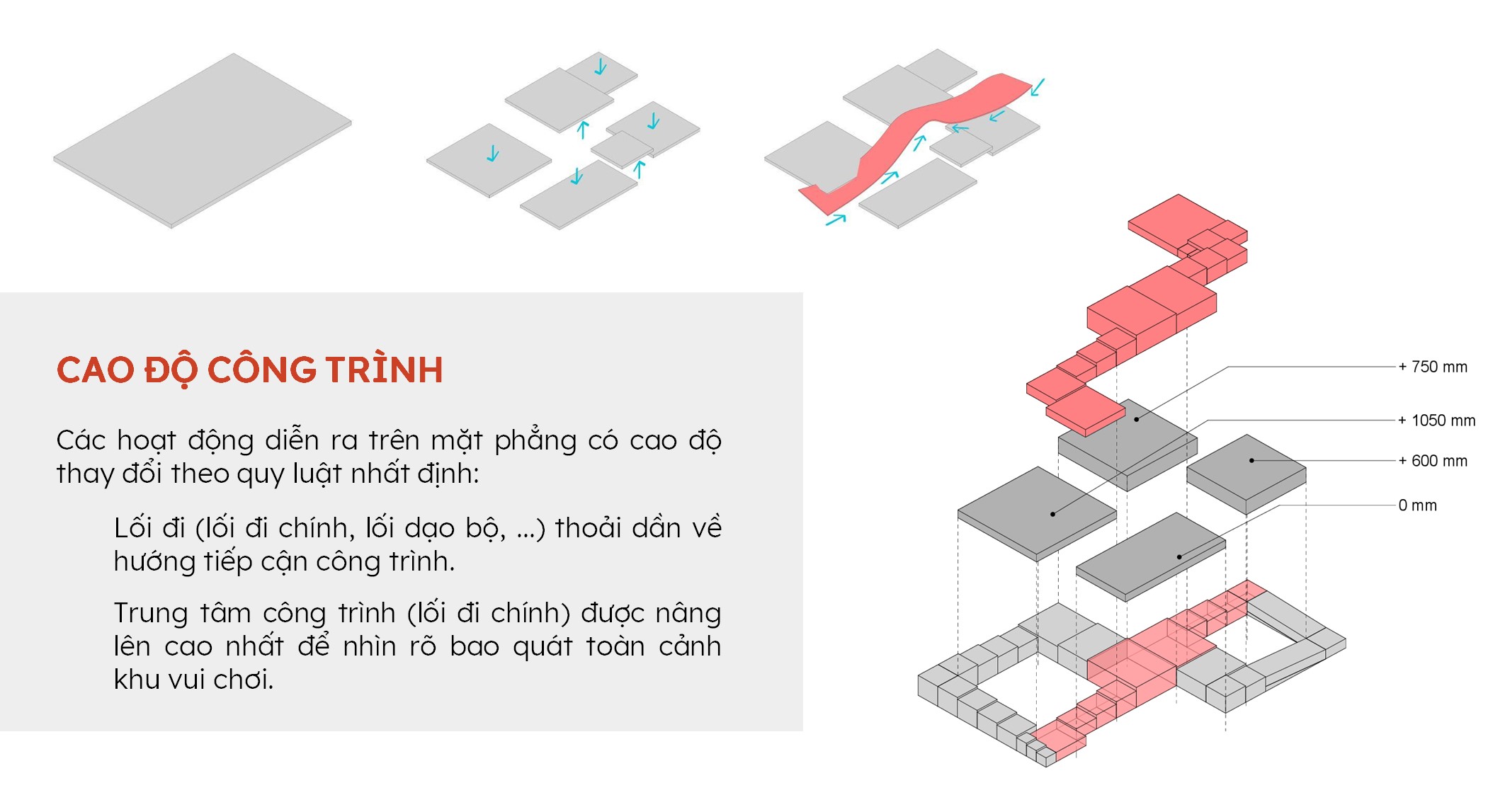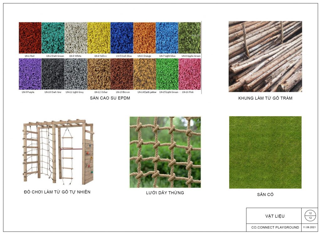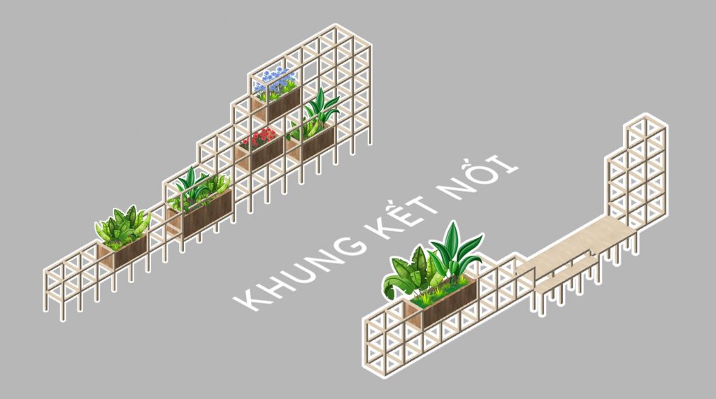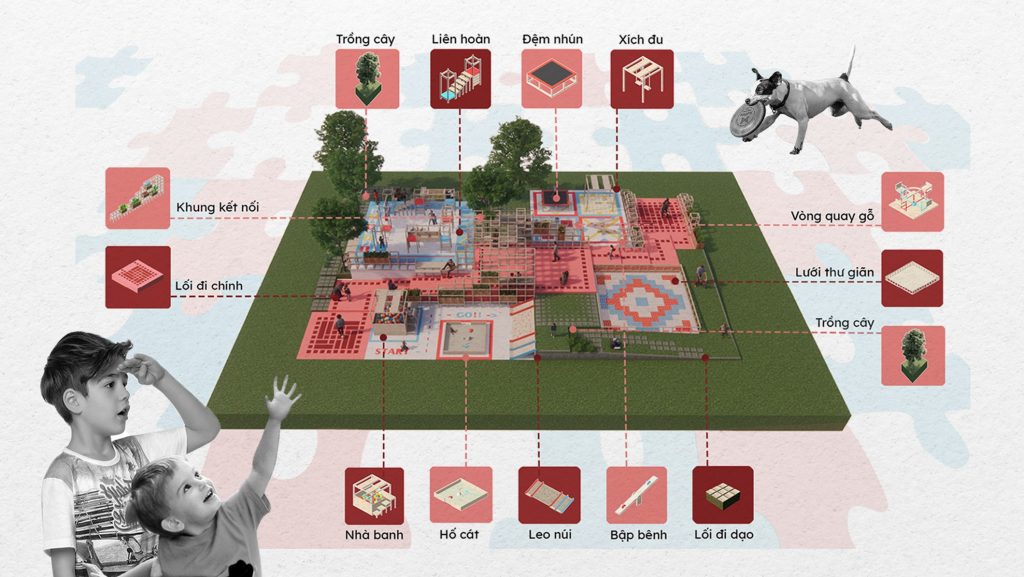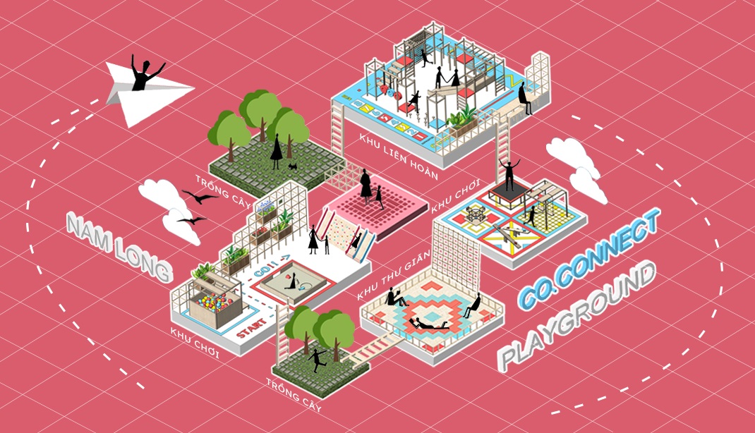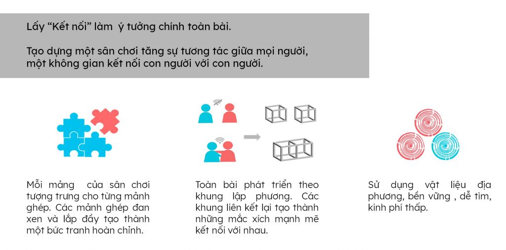 Lấy “Kết nối” làm ý tưởng chính toàn bài. Tạo dựng một sân chơi tăng sự tương tác giữa con người với con người, sử dụng vật liệu địa phương, bền vững, dễ tìm, kinh phí thấp.