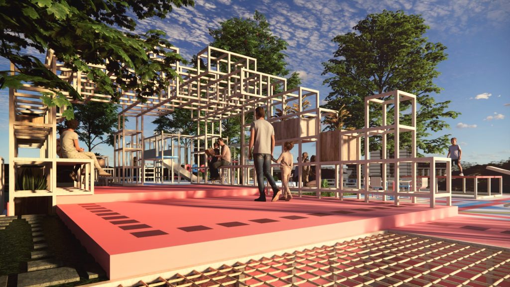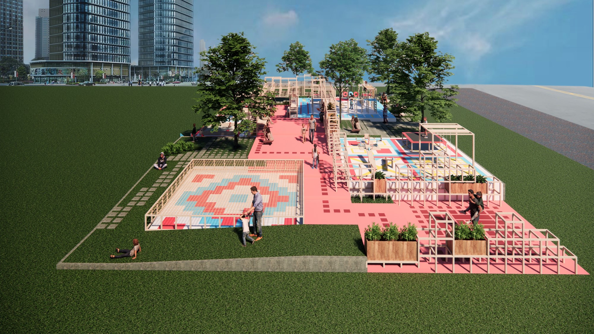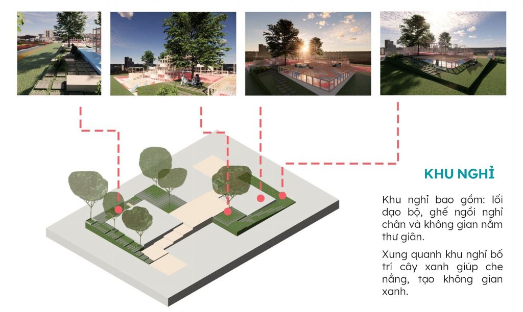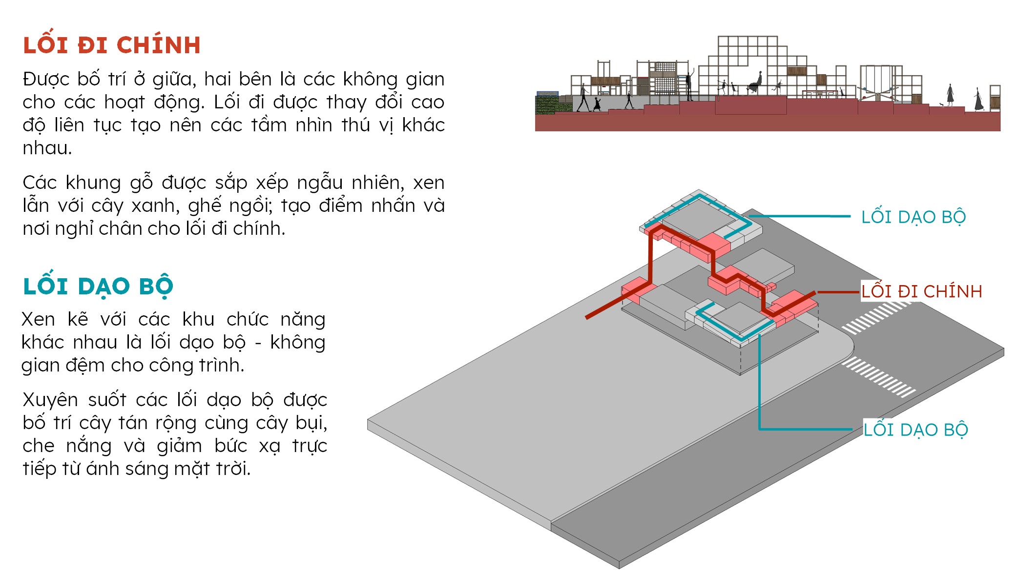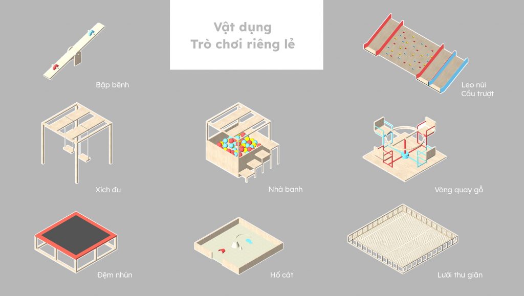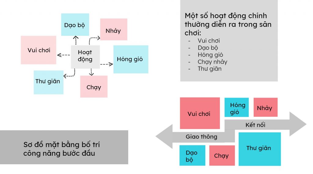 Lấy “Kết nối” làm ý tưởng chính toàn bài. Tạo dựng một sân chơi tăng sự tương tác giữa con người với con người, sử dụng vật liệu địa phương, bền vững, dễ tìm, kinh phí thấp.