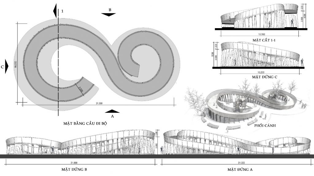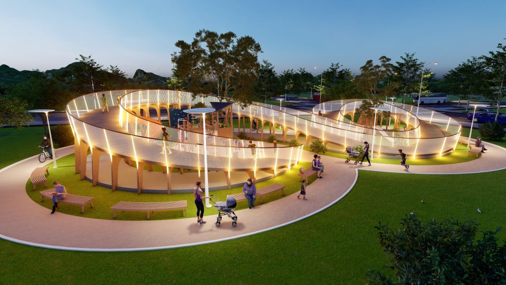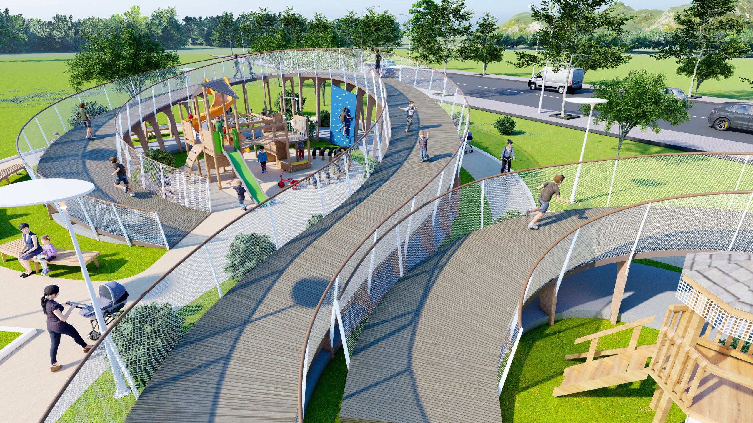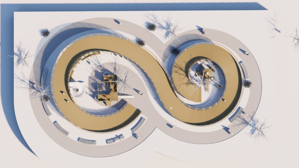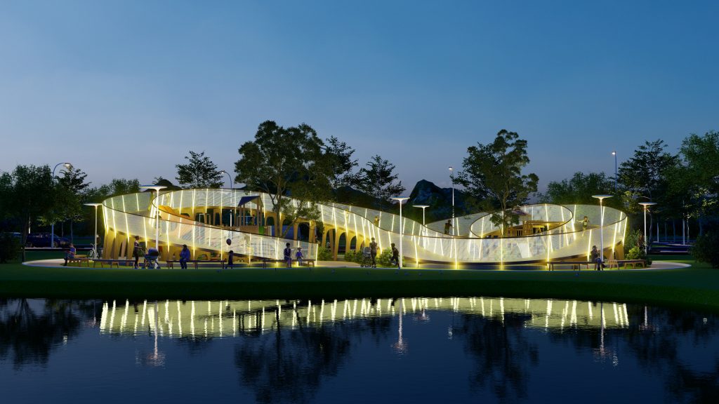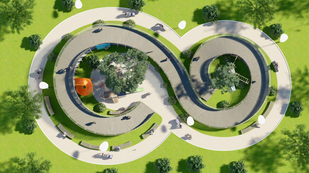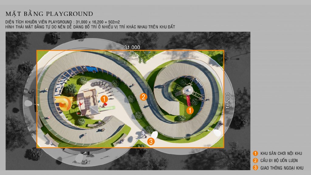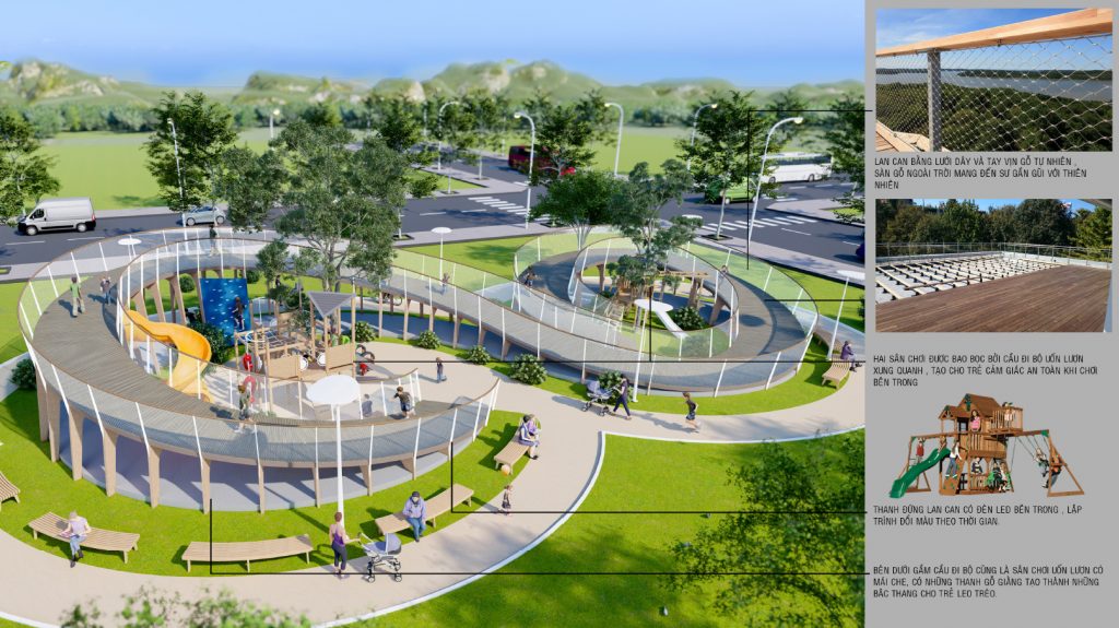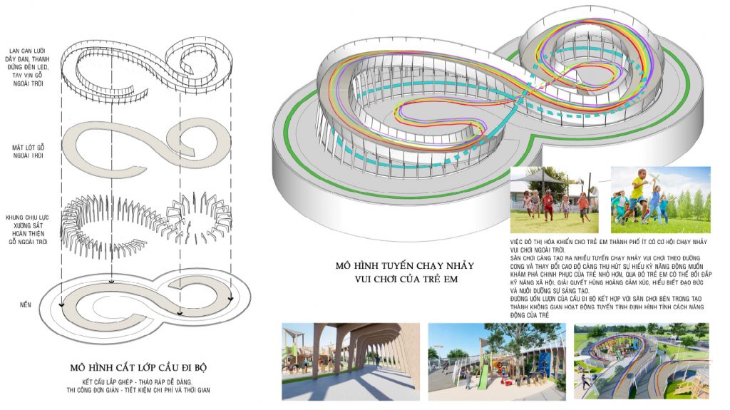 Đường uốn lượn của cầu đi bộ kết hợp với sân chơi bên trong tạo thành không gian hoạt động tuyết tính định hình tính cách năng động của trẻ.