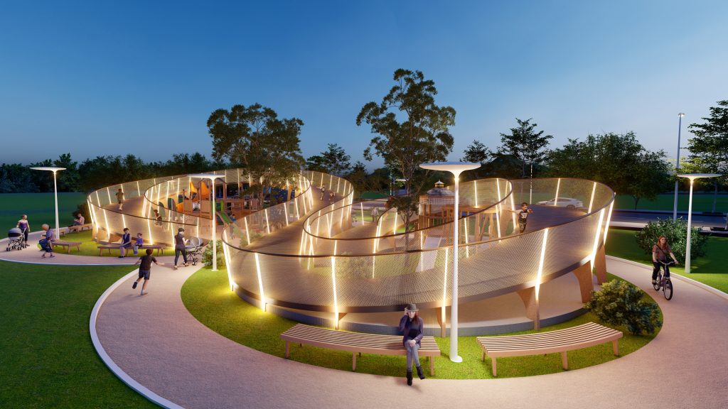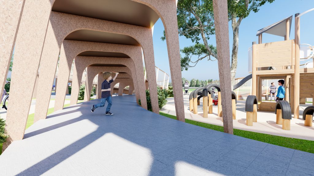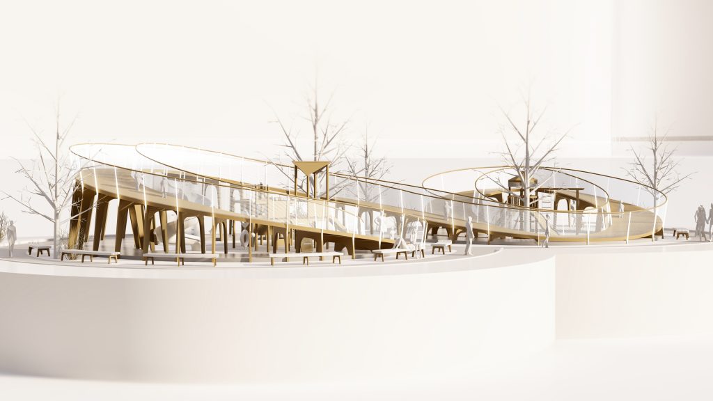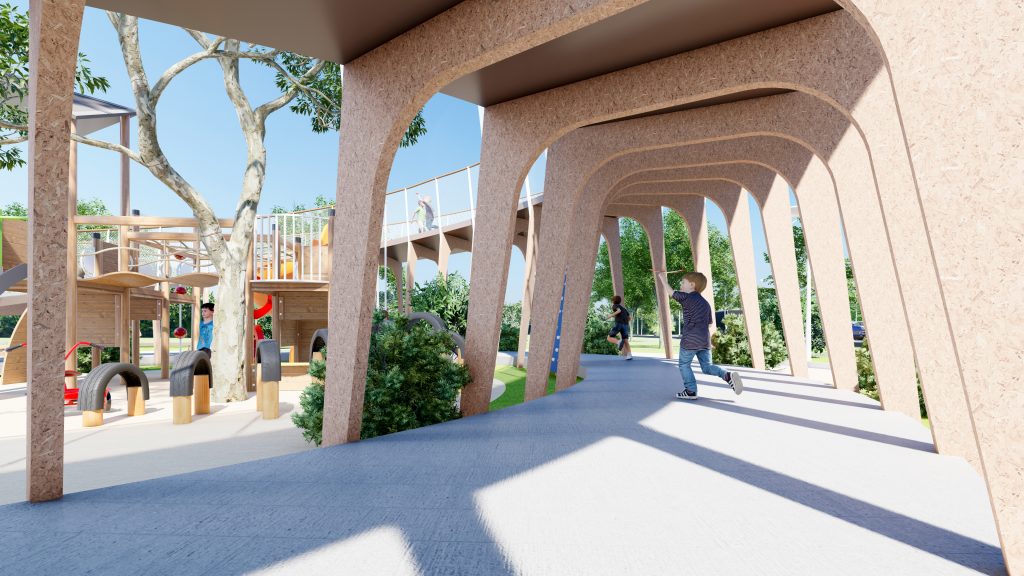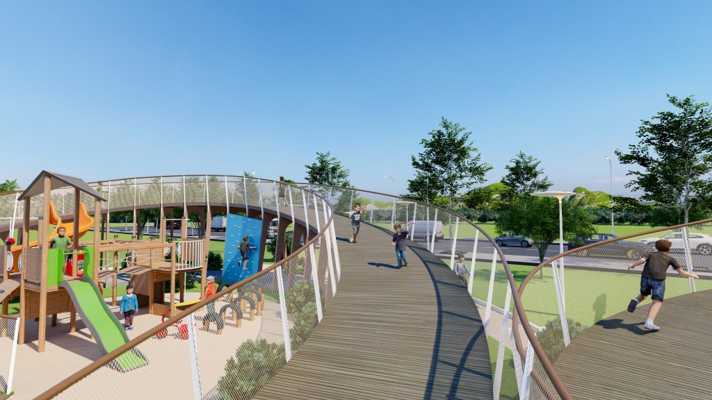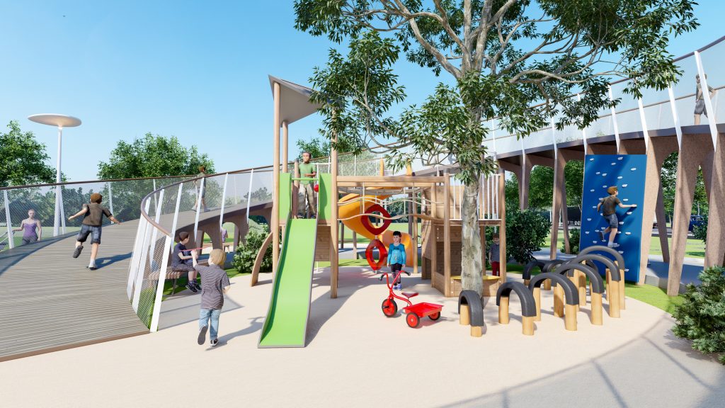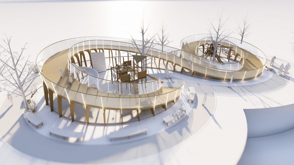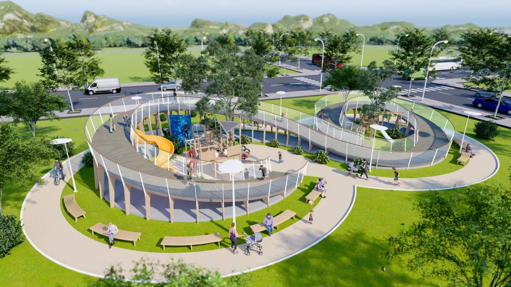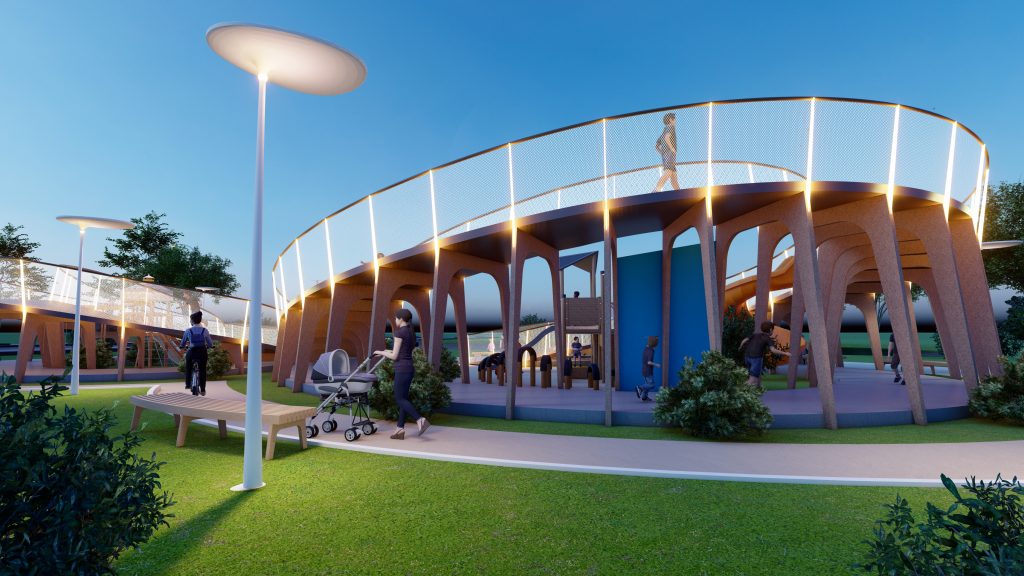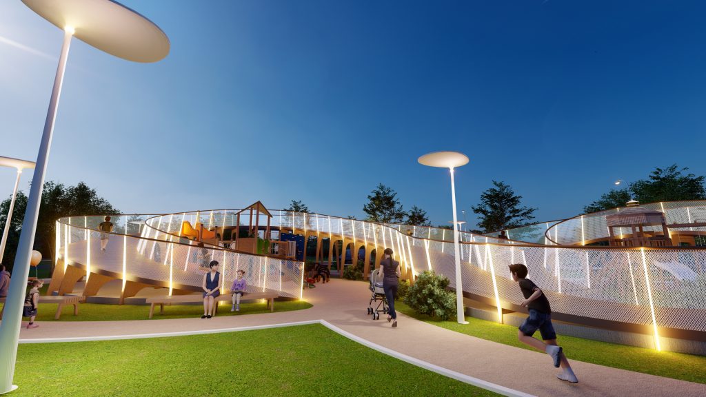 Đường uốn lượn của cầu đi bộ kết hợp với sân chơi bên trong tạo thành không gian hoạt động tuyết tính định hình tính cách năng động của trẻ.