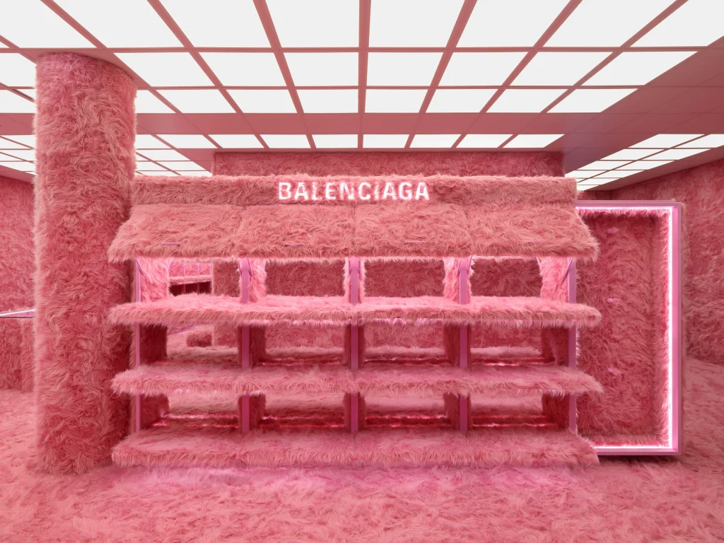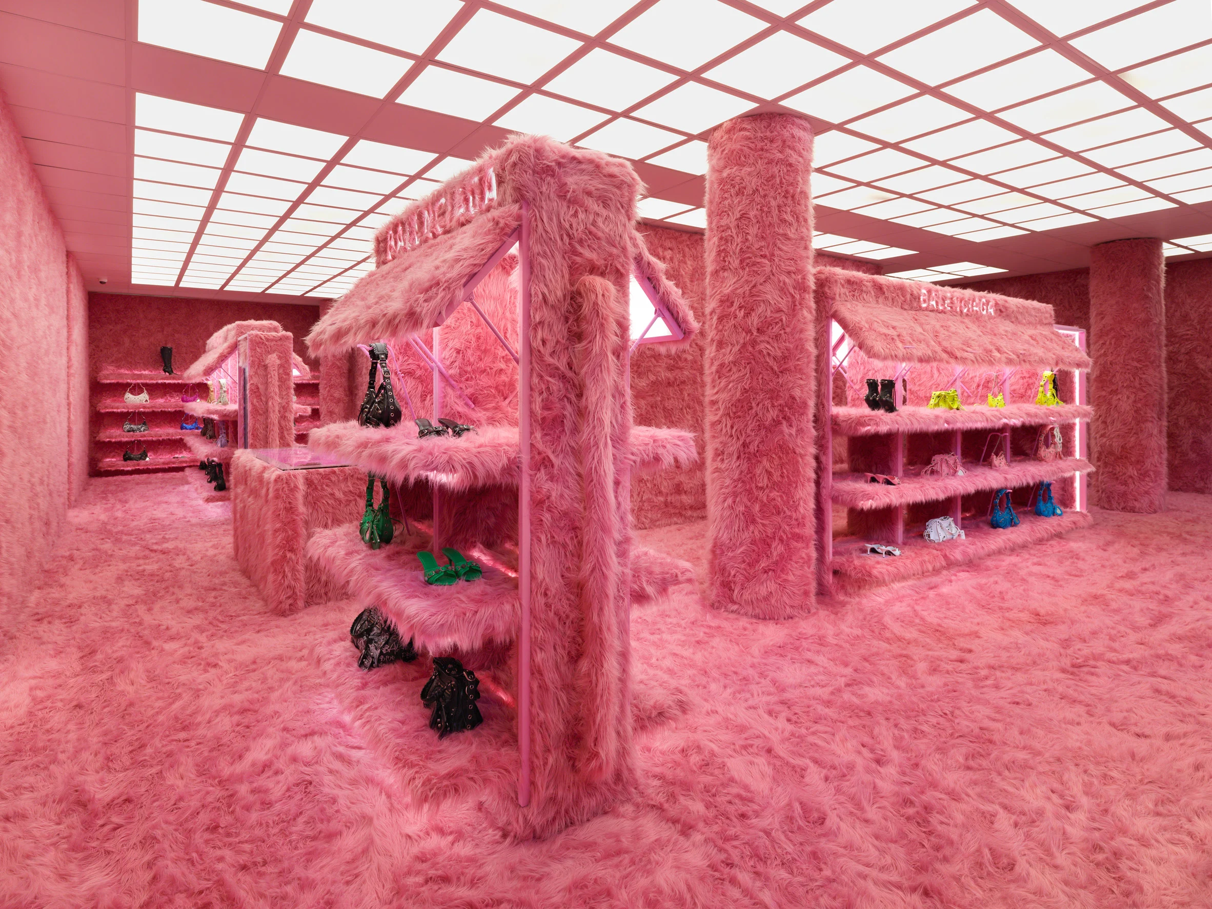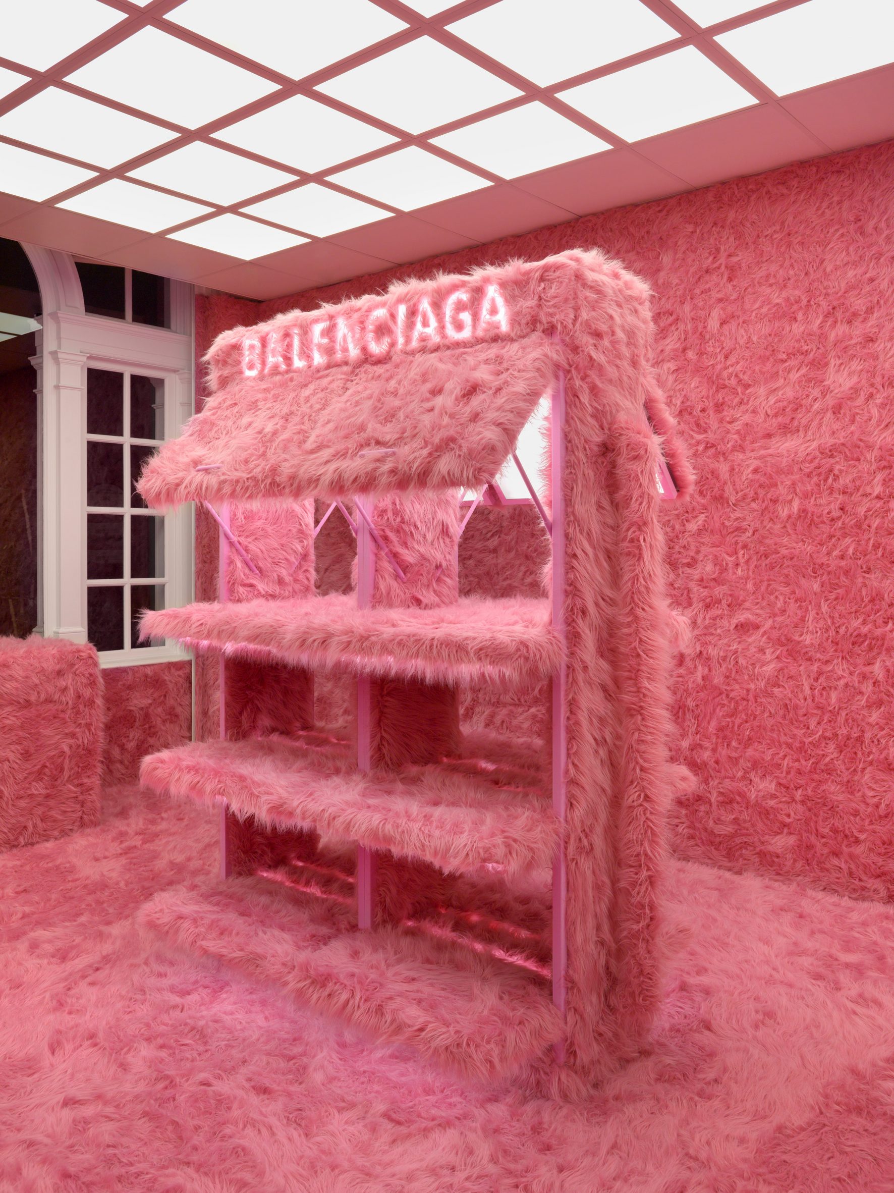 Để ra mắt bộ sưu tập (BST) Le Cagole, thương hiệu thời trang Balenciaga đã có sự biến tấu độc đáo cho cửa hàng Mount Street của mình ở London theo chủ nghĩa tối đa bằng cách phủ toàn bộ không gian nội thất trong bộ lông màu hồng sặc sỡ.