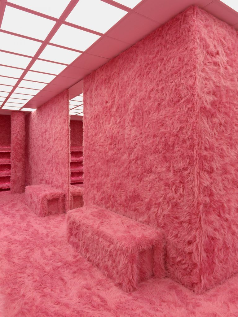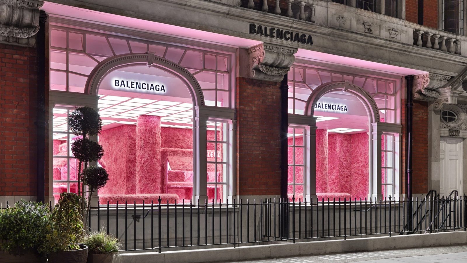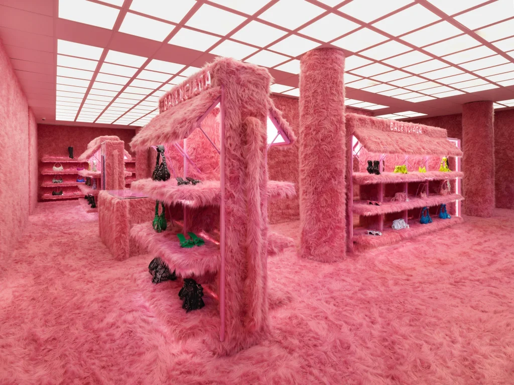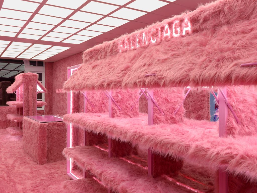 Để ra mắt bộ sưu tập (BST) Le Cagole, thương hiệu thời trang Balenciaga đã có sự biến tấu độc đáo cho cửa hàng Mount Street của mình ở London theo chủ nghĩa tối đa bằng cách phủ toàn bộ không gian nội thất trong bộ lông màu hồng sặc sỡ.
