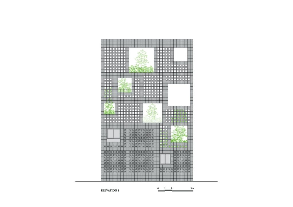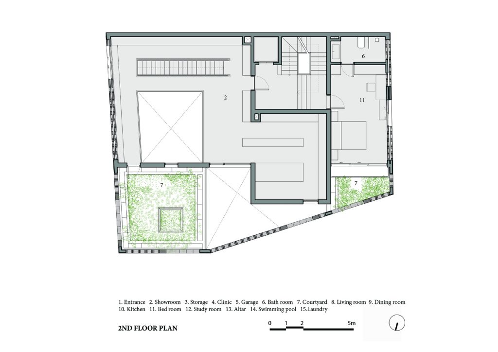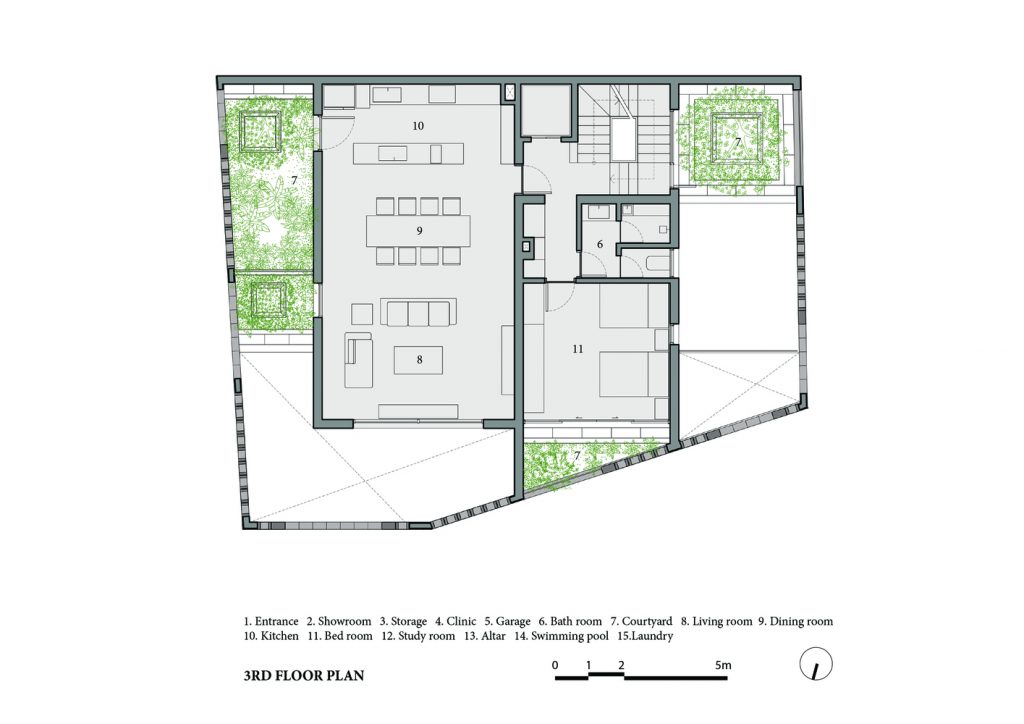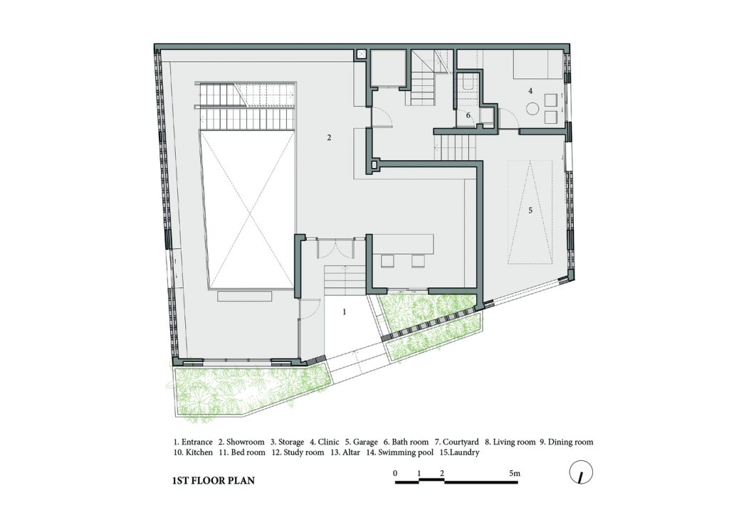 Sự sắp xếp không gian của ngôi nhà cũng dựa trên ngôi nhà lý tưởng của chủ nhân, nơi thiên nhiên đan xen với các chức năng khác của ngôi nhà.