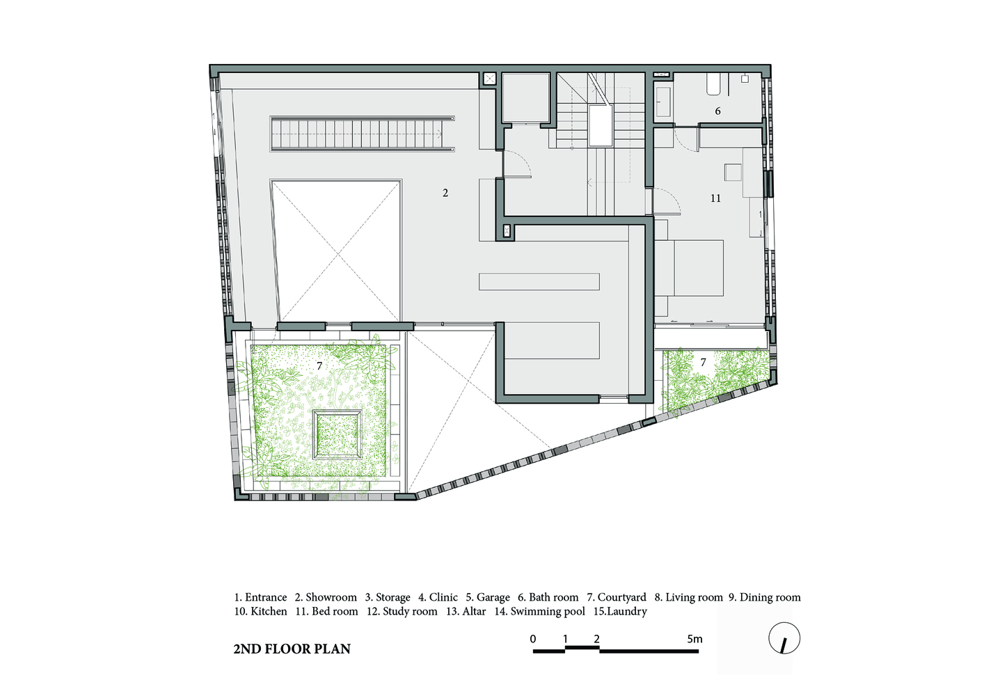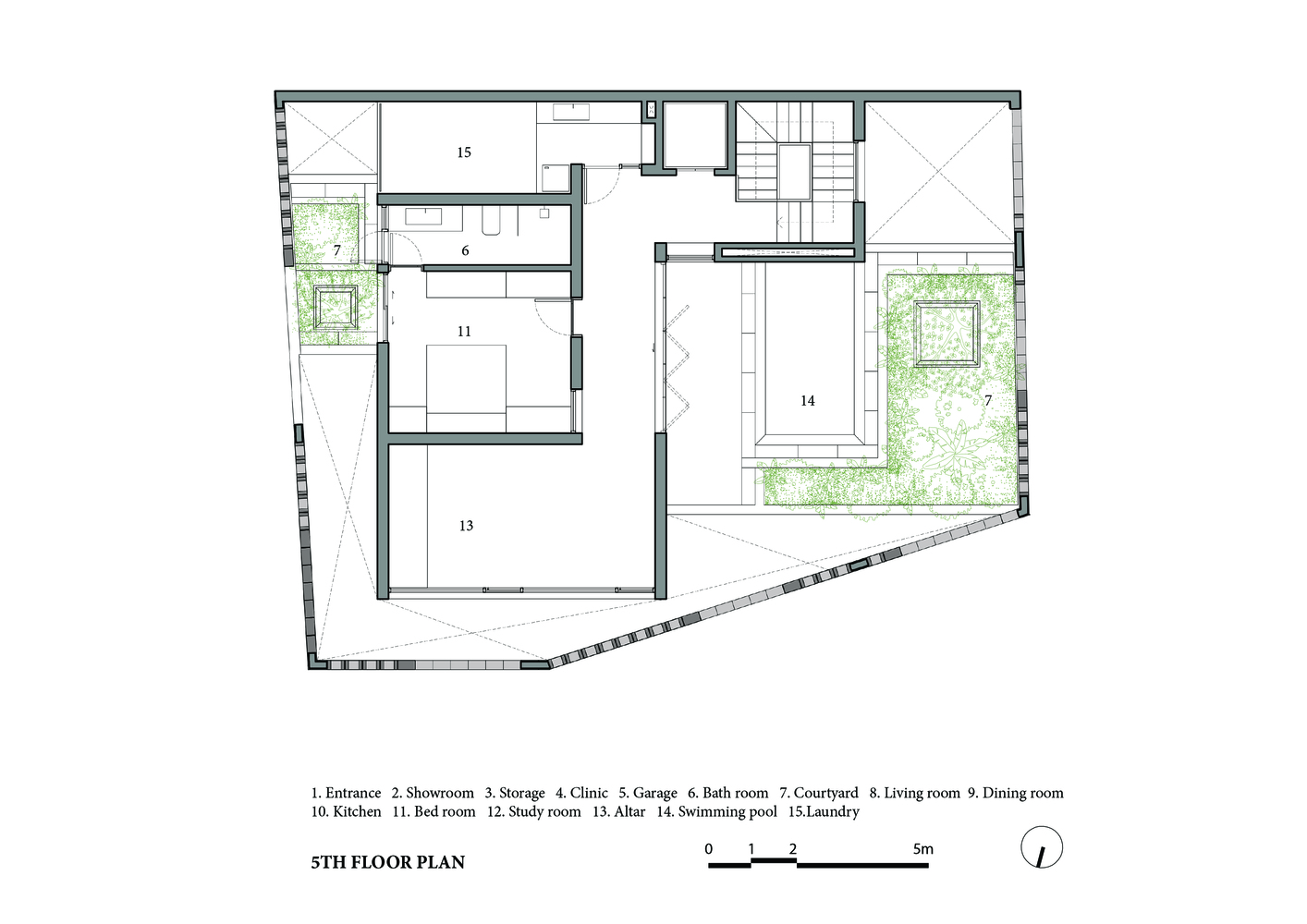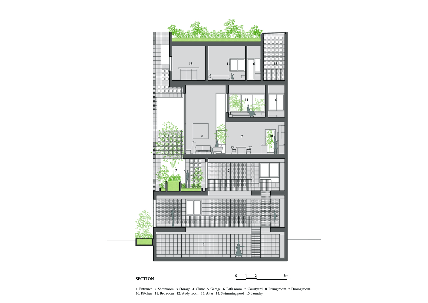 Sự sắp xếp không gian của ngôi nhà cũng dựa trên ngôi nhà lý tưởng của chủ nhân, nơi thiên nhiên đan xen với các chức năng khác của ngôi nhà.