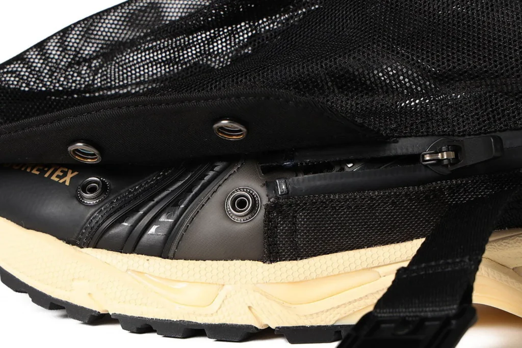 Nếu không có lớp lưới độc đáo và kỳ lạ này thì Bespoke Gel Kayano 14 Gore-Tex trông cũng khá tuyệt với thiết kế có dây buộc màu đỏ thú vị ở giữa làm điểm nhấn. Đôi giày được bọc bằng vải Gore-Tex nổi tiếng, giúp nó không chỉ chống thấm nước mà còn thoáng khí.