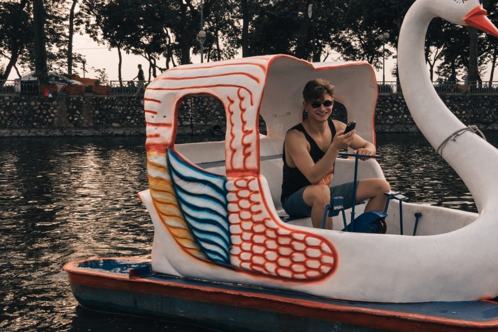 From time to time Alex is pretty struggling with filming me. For example how to make a video look good when we both are sailing on different swans on the Truc Bach lake. When they shake all the time and wind keeps spinning them around.