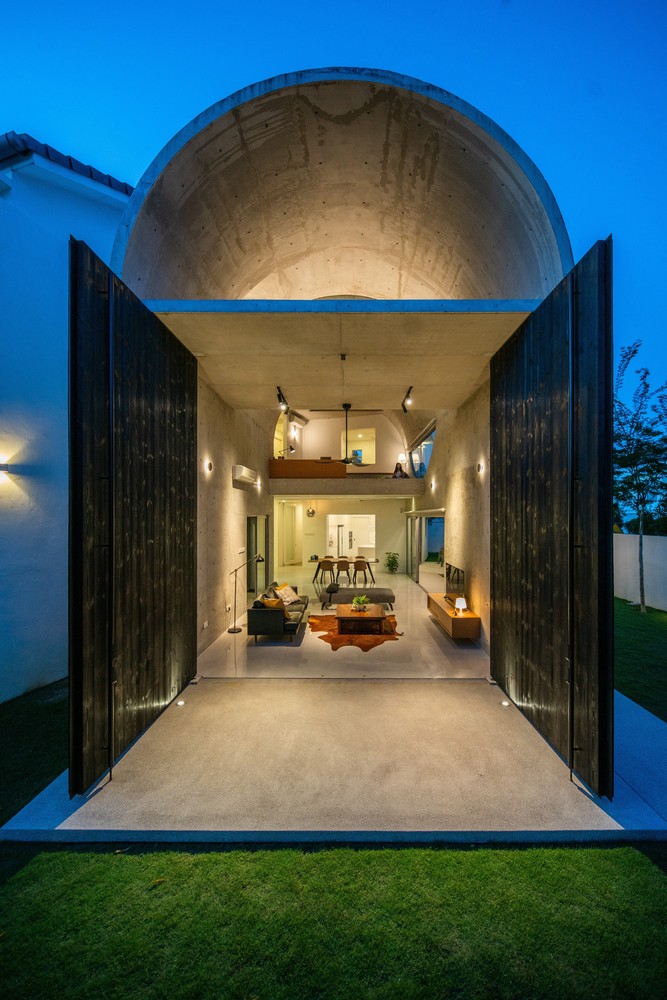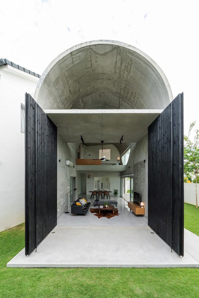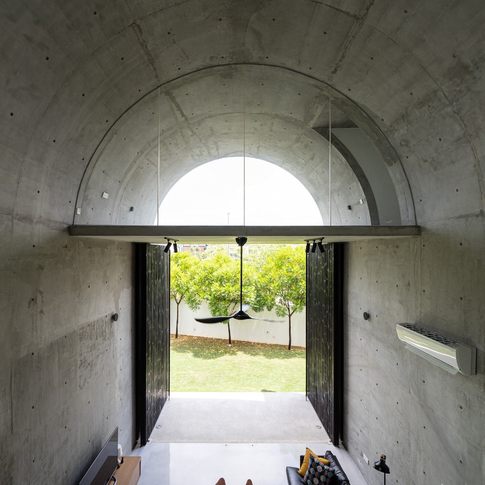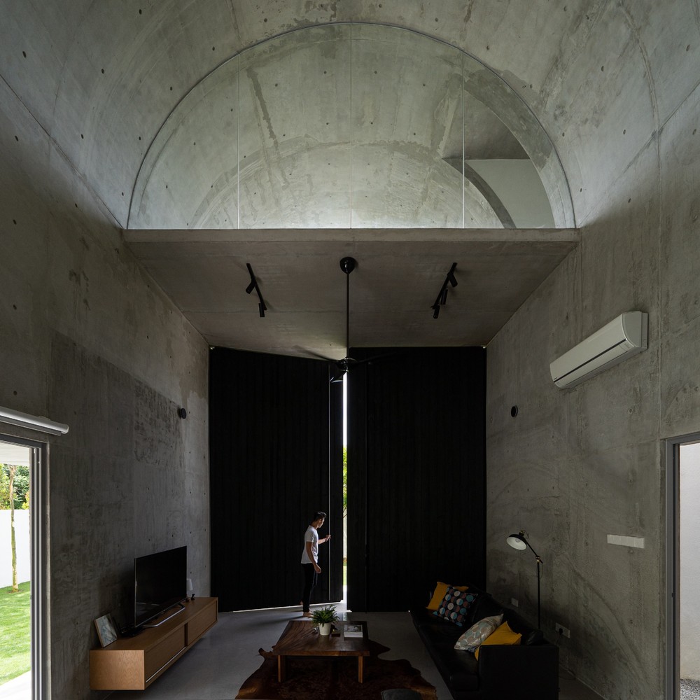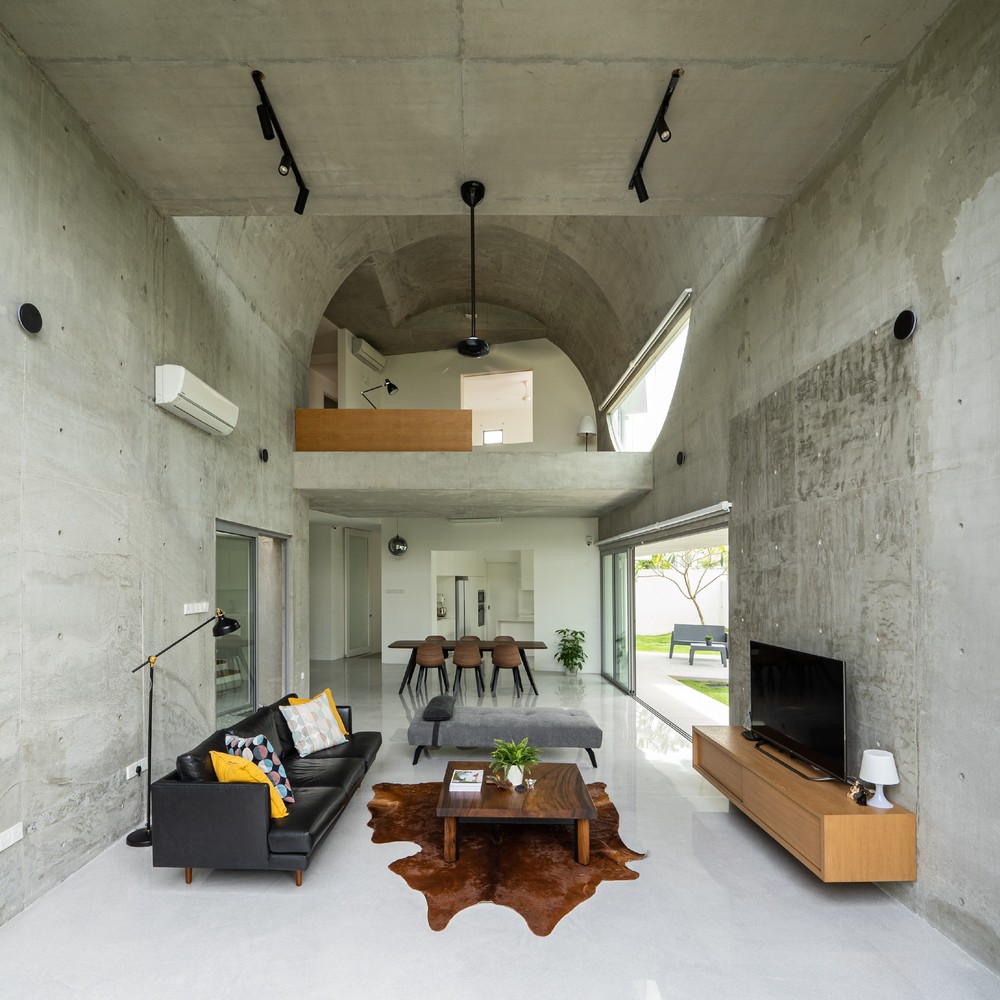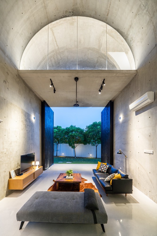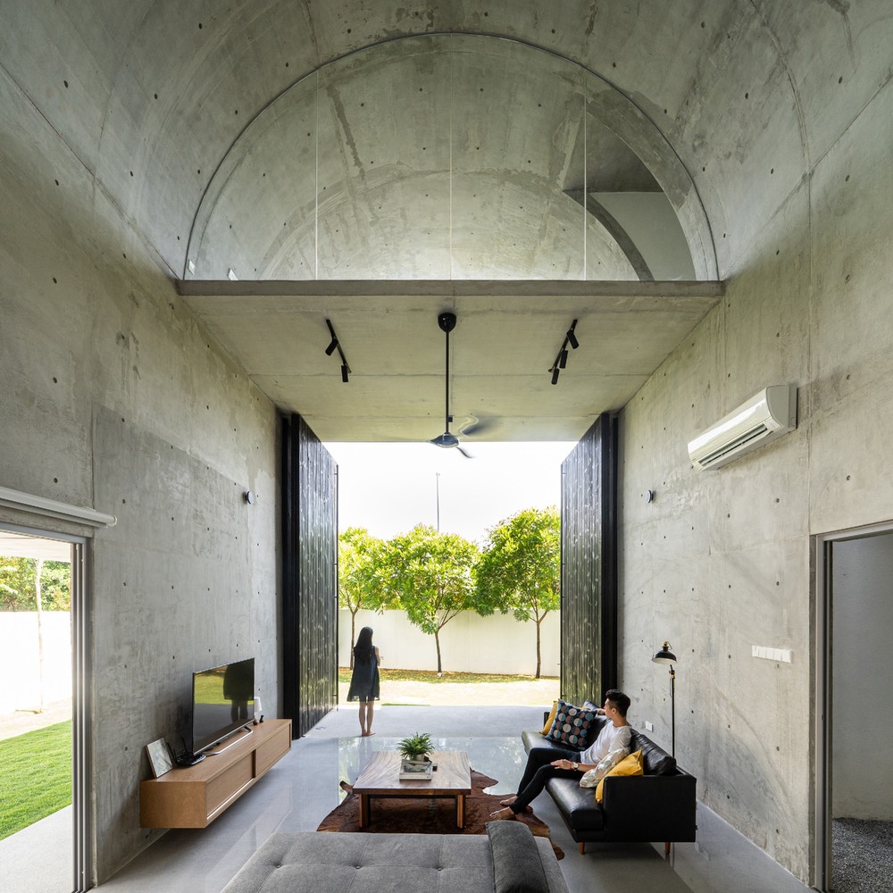 Không gian xuất hiện liên tục thông qua phần mở rộng của vòm và được phóng đại hơn nữa thông qua chất liệu bê tông hoàn thiện từ sàn đến trần. Phần mở rộng được tăng cường thêm bởi hai cửa lớn mở ra khu vườn. Phối cảnh không bị gián đoạn từ trong ra ngoài ngay lập tức kết nối nội thất với thiên nhiên.