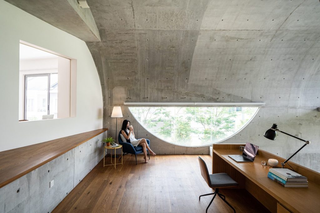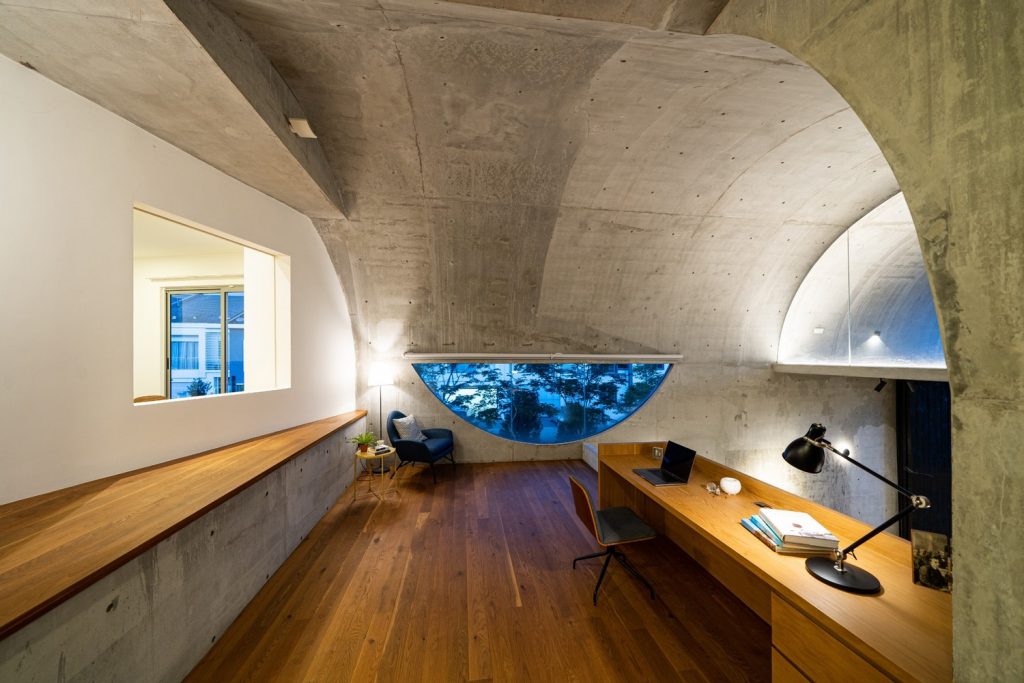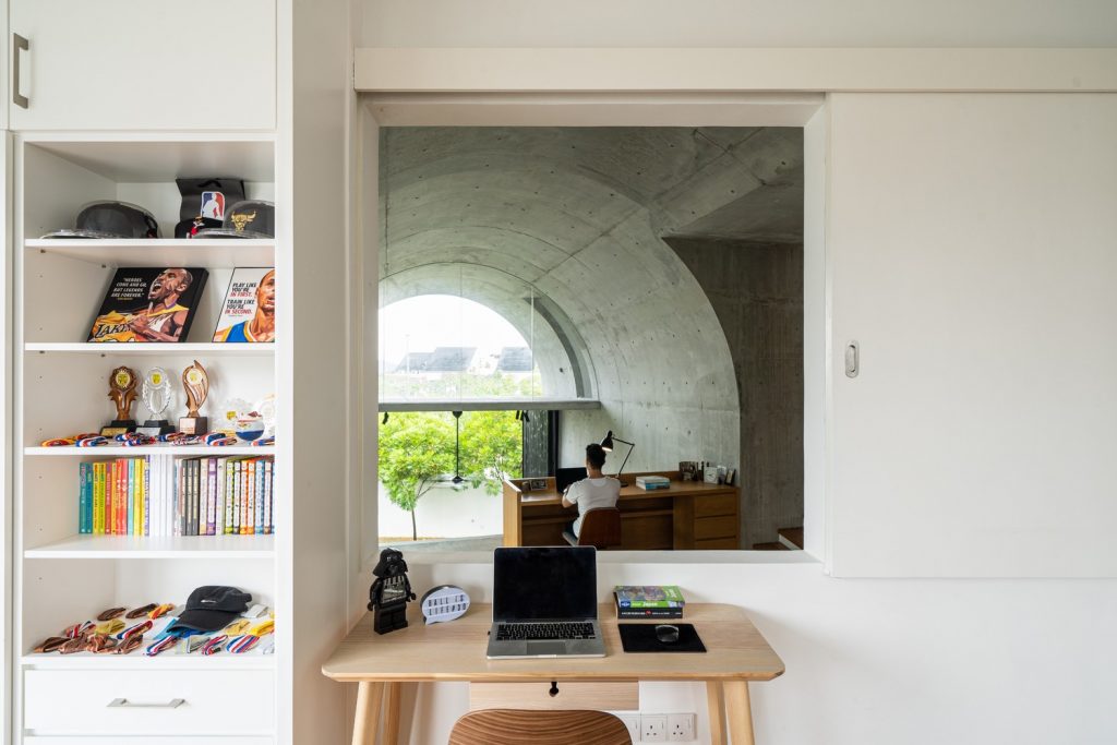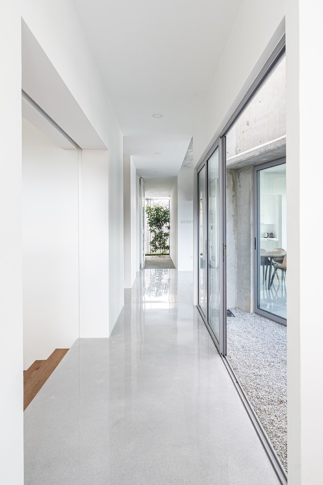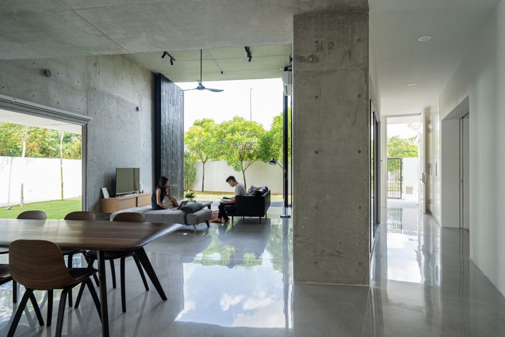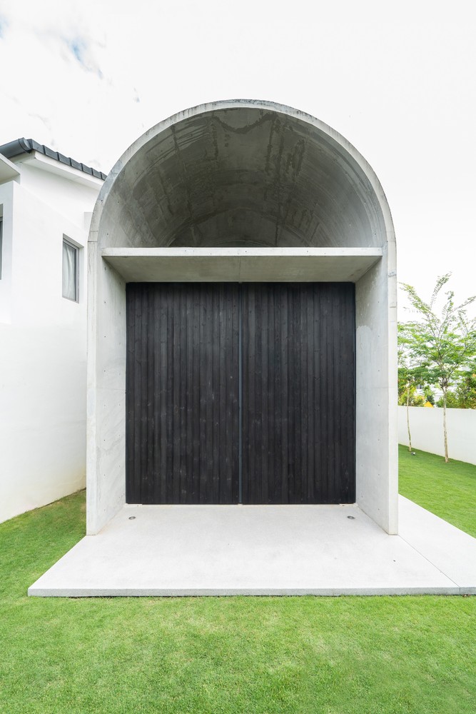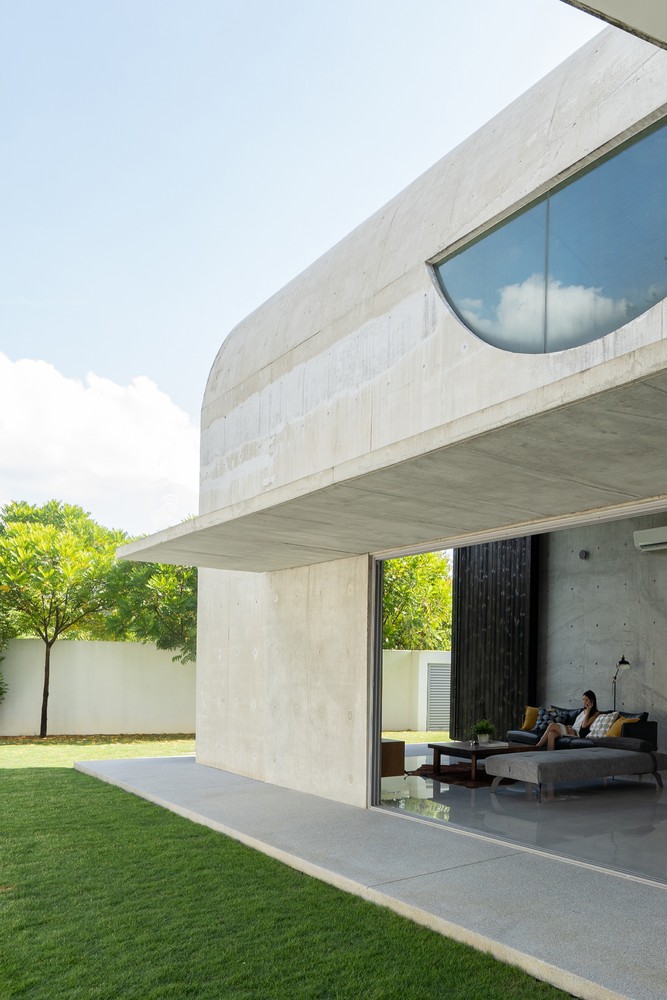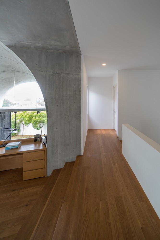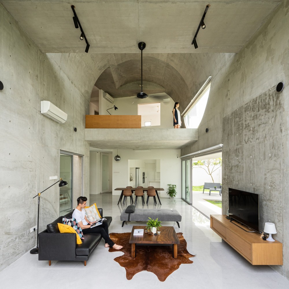 Không gian xuất hiện liên tục thông qua phần mở rộng của vòm và được phóng đại hơn nữa thông qua chất liệu bê tông hoàn thiện từ sàn đến trần. Phần mở rộng được tăng cường thêm bởi hai cửa lớn mở ra khu vườn. Phối cảnh không bị gián đoạn từ trong ra ngoài ngay lập tức kết nối nội thất với thiên nhiên.