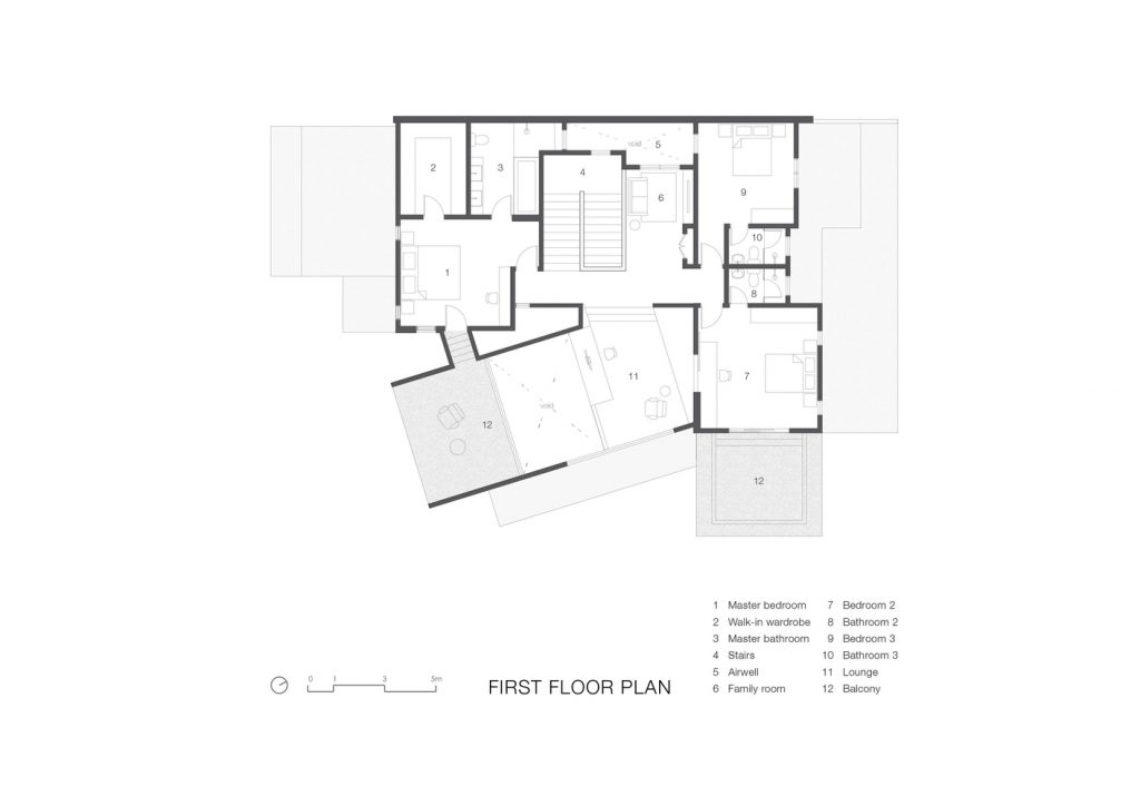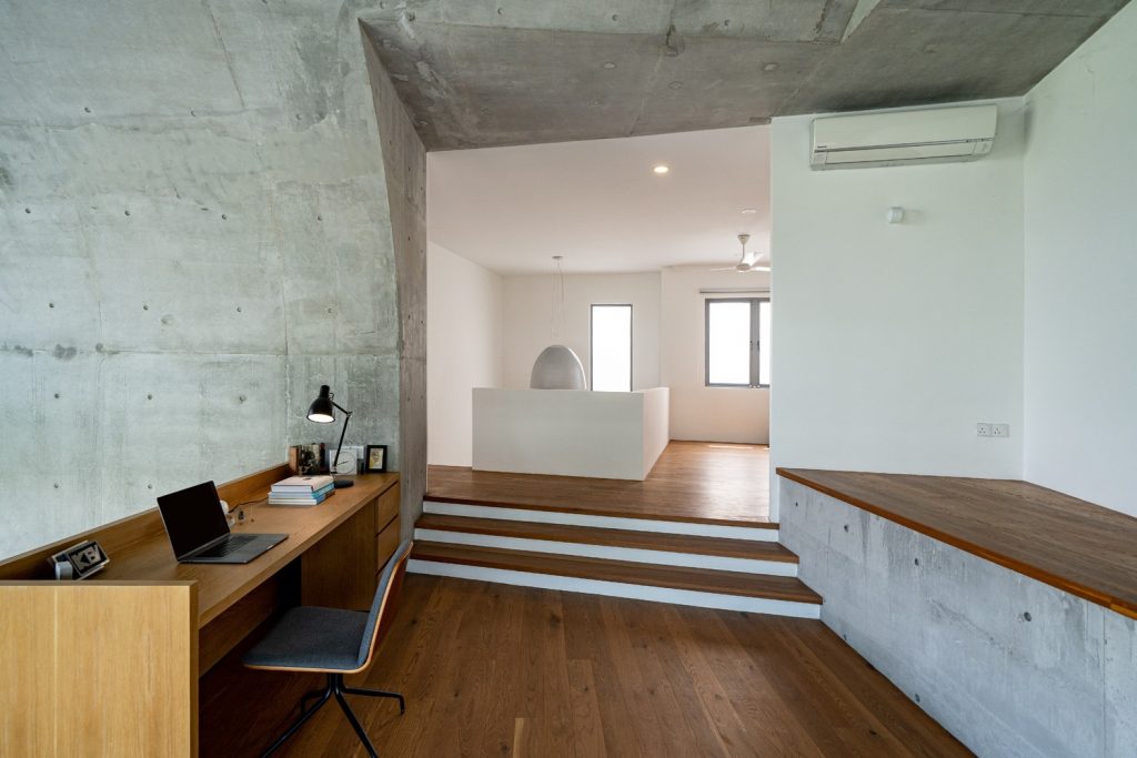 Tầng trên được thiết kế đầy táo bạo, chơi đùa với các đường cong và cấp độ. Các không gian được chia ra thành từng lớp, tạo ra sự phân cấp của không gian. Phòng làm việc nhìn ra không gian sống và liền kề đó là một góc bậc thềm để thư giãn. Phía sau là phòng ngủ nhìn ra các không gian này. Phòng ngủ chính kết nối qua một cây cầu với phần tầng ngoài cùng của tòa nhà phụ là một ban công mở.