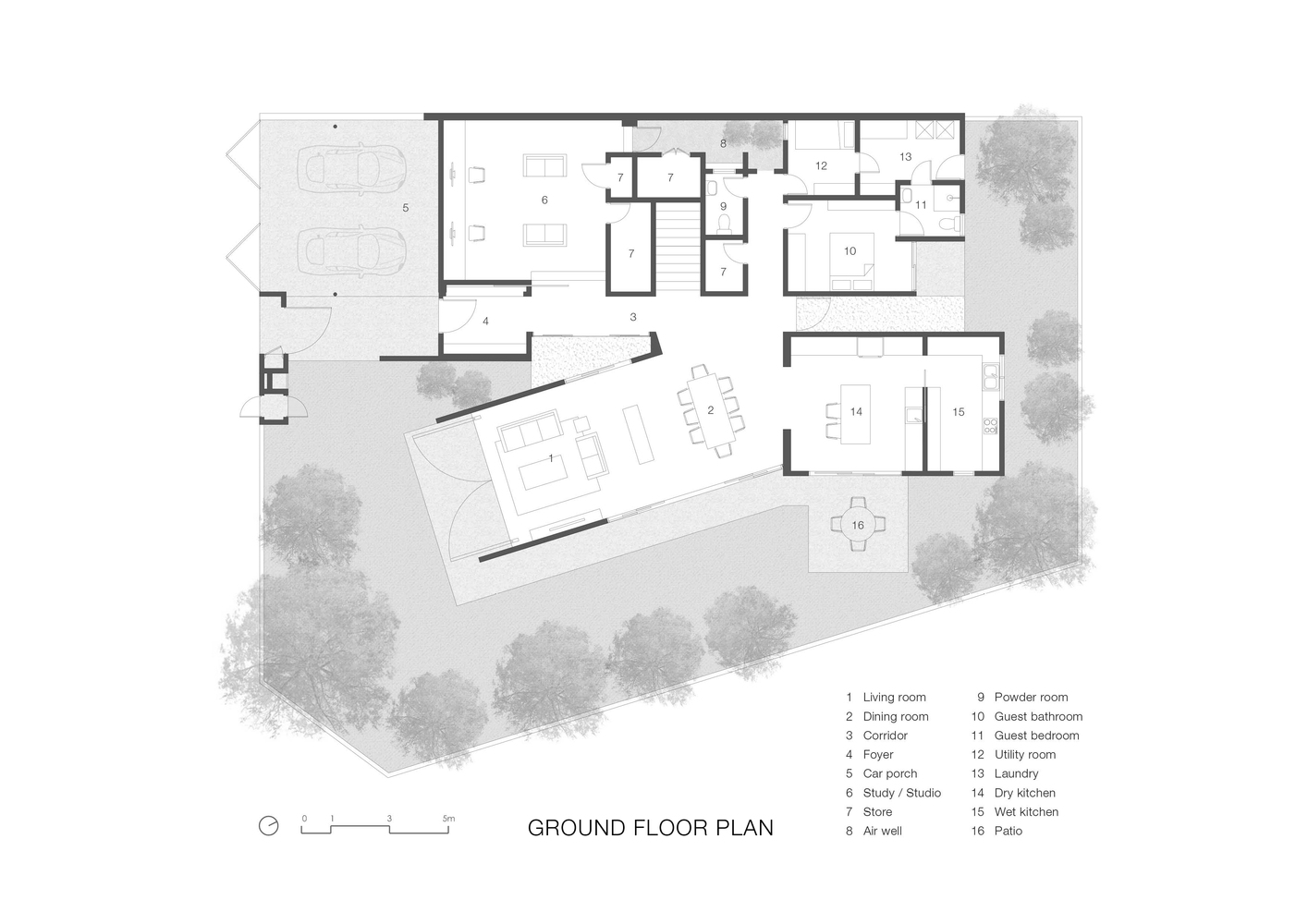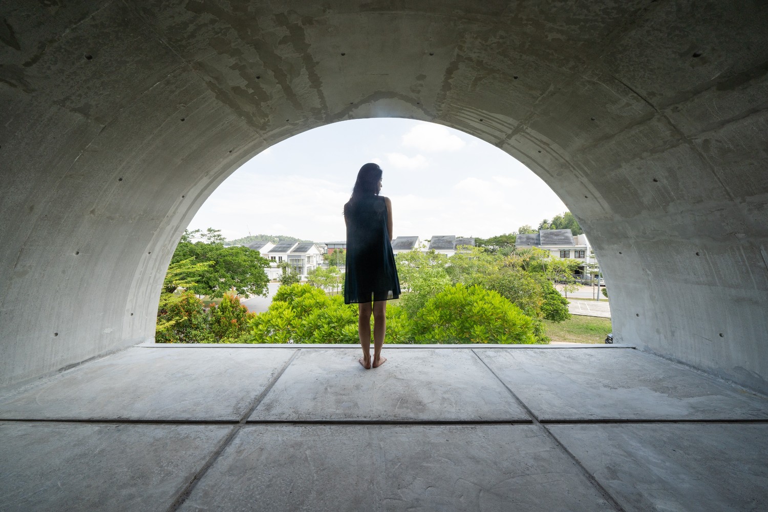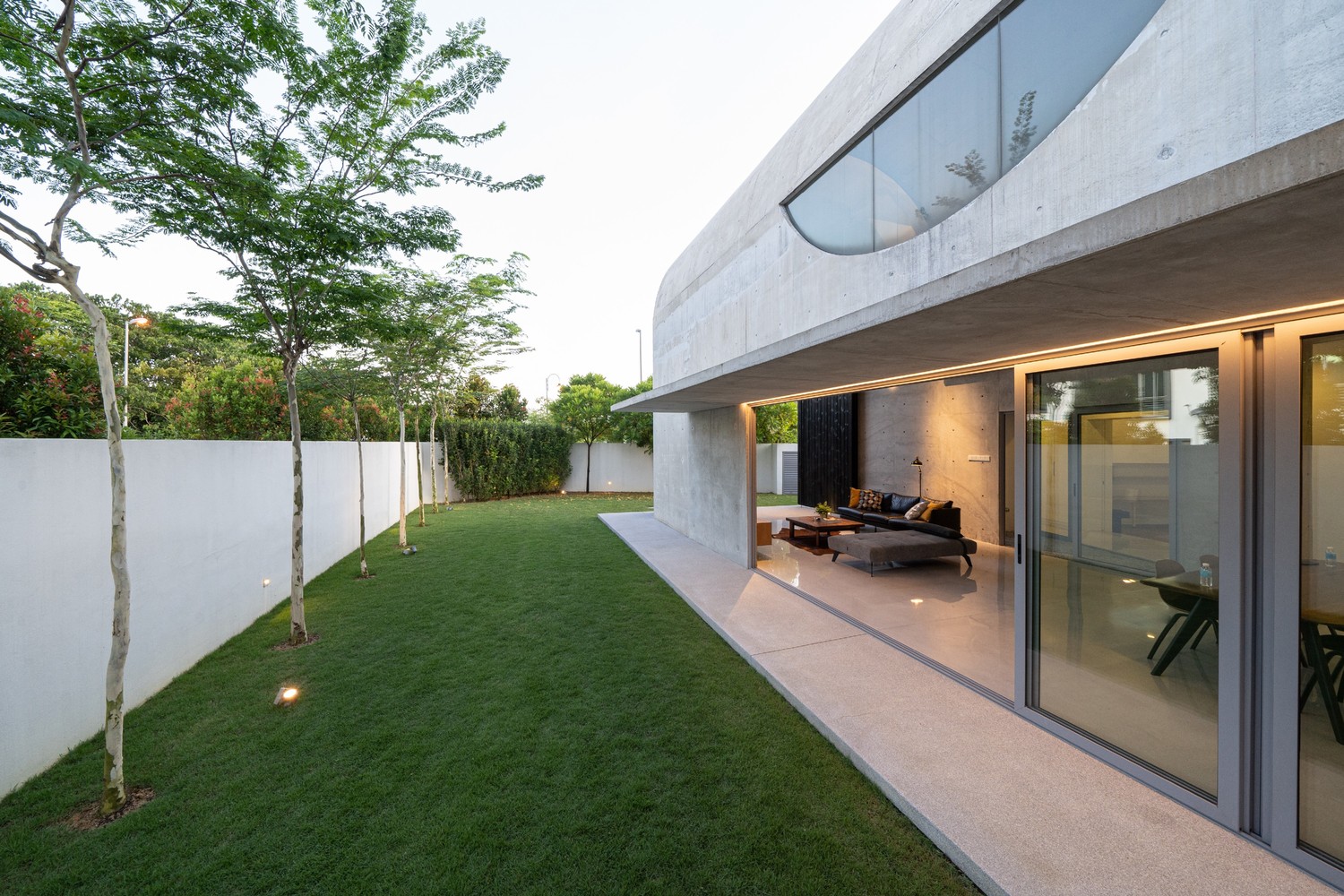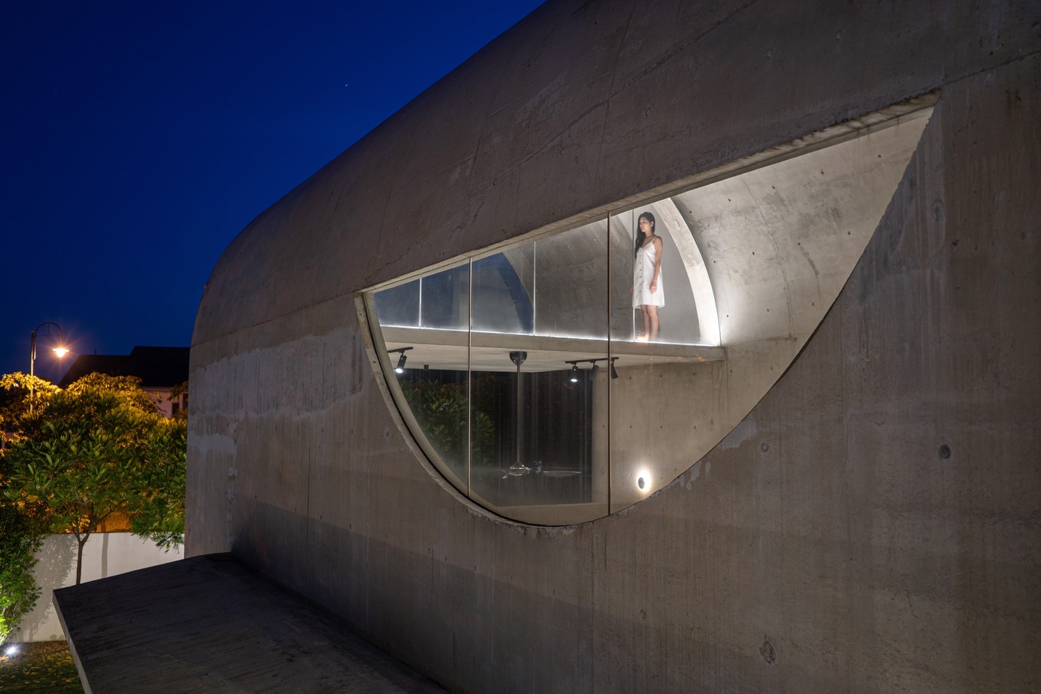 Không gian xuất hiện liên tục thông qua phần mở rộng của vòm và được phóng đại hơn nữa thông qua chất liệu bê tông hoàn thiện từ sàn đến trần. Phần mở rộng được tăng cường thêm bởi hai cửa lớn mở ra khu vườn. Phối cảnh không bị gián đoạn từ trong ra ngoài ngay lập tức kết nối nội thất với thiên nhiên.