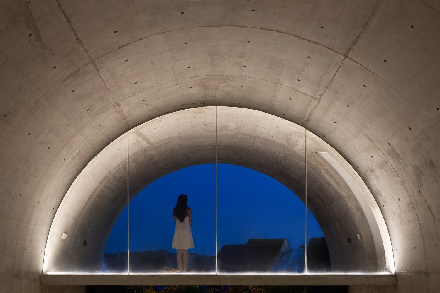 Để chống lại sự nặng nề của hầm bê tông, các lỗ hở đã được chạm khắc cẩn thận ở tầng trên. Cửa sổ vòm ngược được vẽ thành hình chữ “S” liên tục khi gặp lỗ mở phía trước. Bước qua các tầng trên, sự liên tục này vang vọng khắp không gian khi các đường mở và mái vòm gặp nhau.