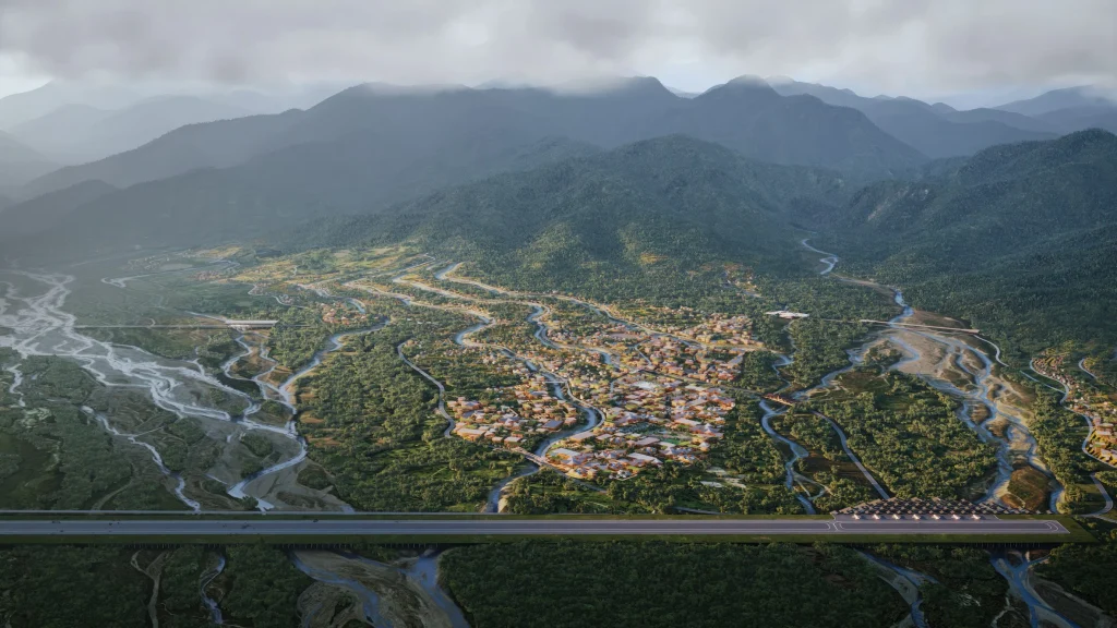 Dưới chân thung lũng, một sân bay quốc tế sẽ được xây dựng với nhà ga bằng gỗ đóng vai trò là cây cầu và đường băng được nâng cao bắc qua nhiều con sông. Những cây cầu khác sẽ bao gồm một trường đại học, trung tâm chăm sóc sức khỏe, chợ và một trung tâm tâm linh Vajrayana bắc qua một con sông.