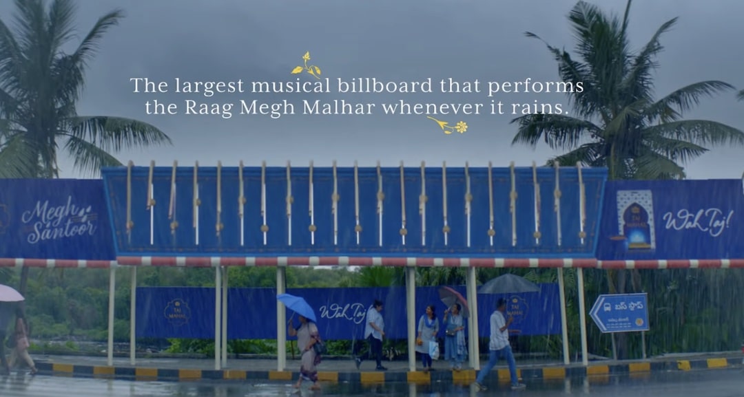 Có tên là Megh Santoor, chiếc biển quảng cáo với chiều dài tận 45m này được đặt bên ngoài ga xe lửa Vijayawada ở Andhra Pradesh, Ấn Độ. Khi trời mưa, nước sẽ đọng lại trên một hệ thống thanh chứa được thiết kế đặc biệt mô phỏng nhạc cụ santoor. Khi nước đầy, các thanh này sẽ tự động rơi xuống và đánh vào dây đàn, tạo nên một giai điệu đầy du dương. Giai điệu này chính là Raag Megh Malhar, một giai điệu cổ điển của Ấn Độ gắn liền với những cơn mưa.