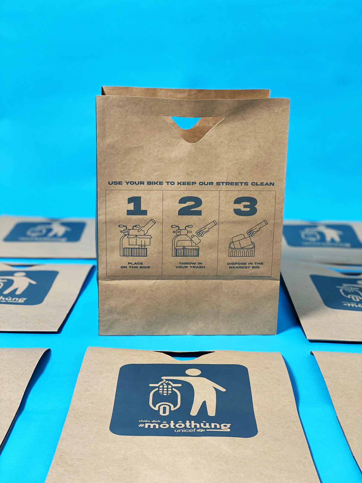 Ý tưởng khá đơn giản: UNICEF Việt Nam sẽ cung cấp những chiếc túi phân hủy sinh học với giá cả hợp lý cho người dân để đặt trên giỏ xe máy, tạo thành những “thùng rác di động”, rất tiện lợi để thu gom rác của cá nhân hoặc người xung quanh.