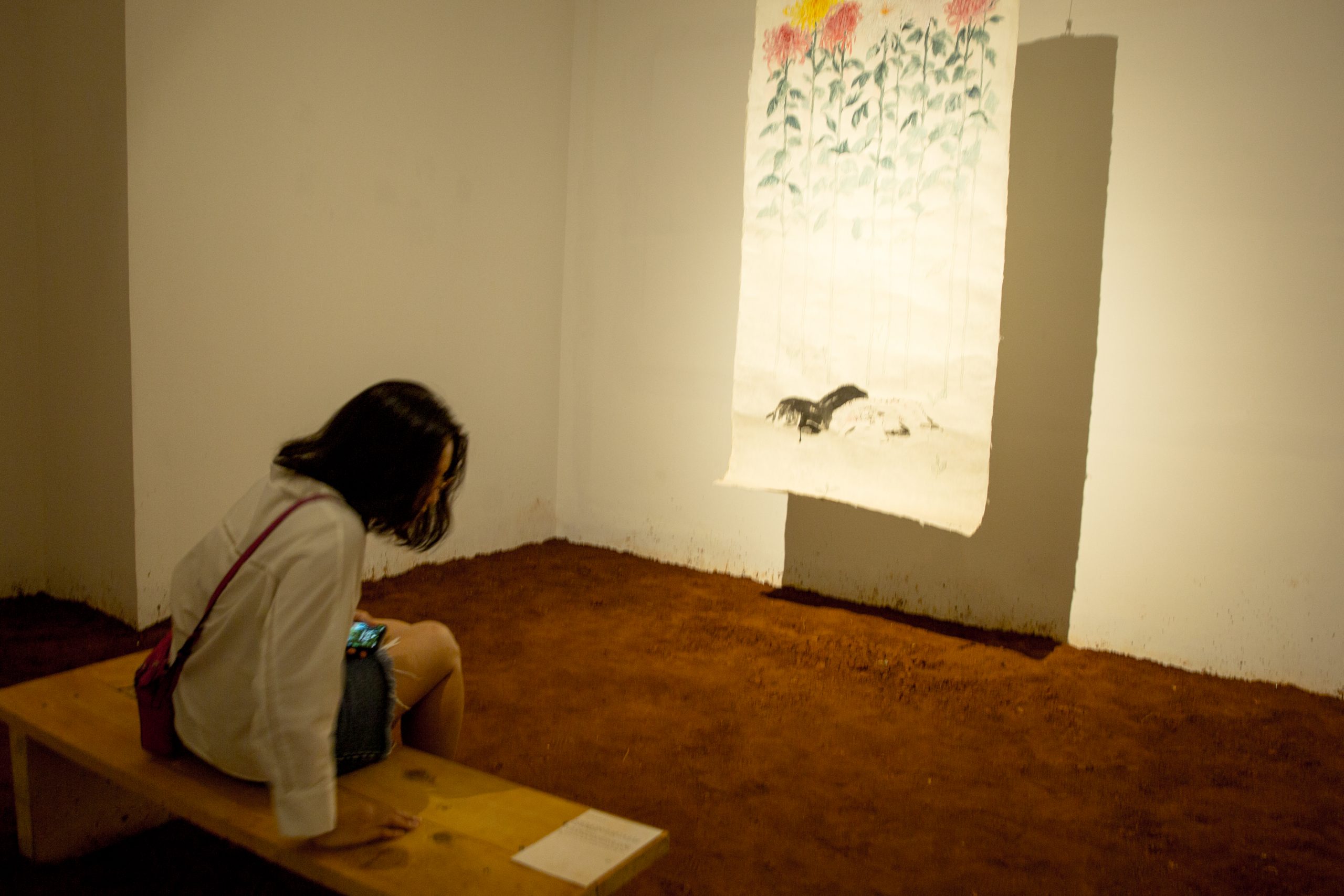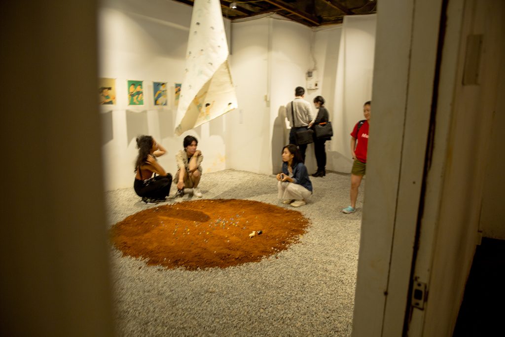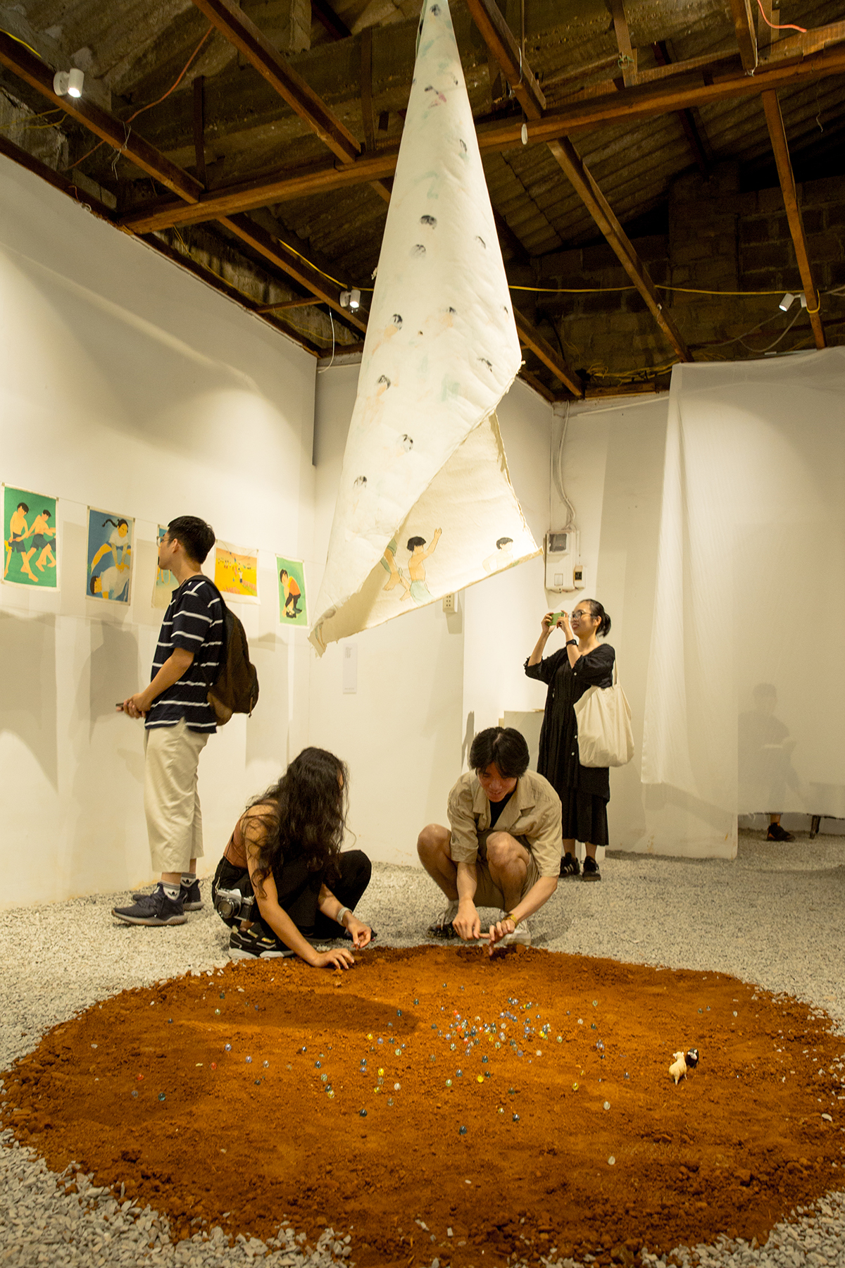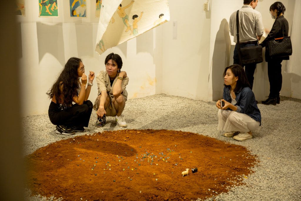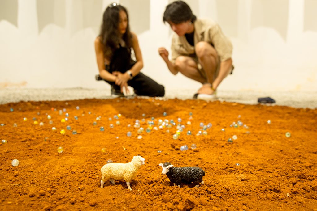 Gian phòng triển lãm bên ngoài được rải đá, xen vào trung tâm là phần cát đỏ được rải theo hình tròn, đặt trên đó là các viên bi và mô hình 2 chú cừu trắng – đen, người xem có thể đến thoải mái chơi bắn bi trong khoảng đất tròn đó, treo bên trên là 1 bức tranh lớn vẽ về trò chơi bịt mắt bắt dê.