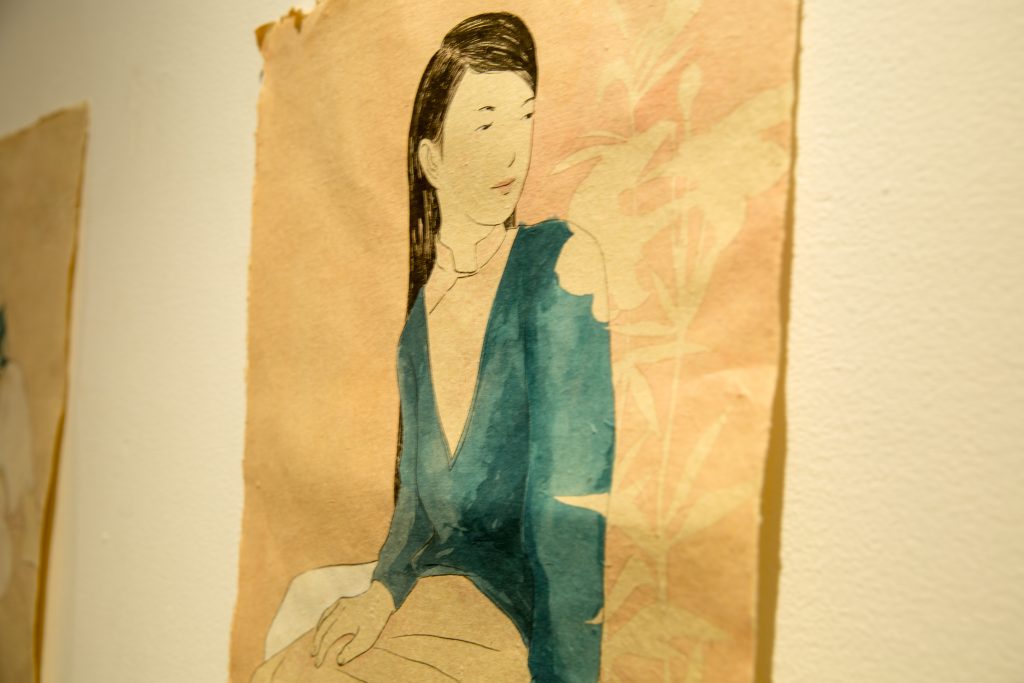 Một số ít tác phẩm trong này Ngân lấy từ những dự án năm rồi, còn lại là được tiến hành vẽ từ tháng 5 năm nay, ngay trong đợt dịch Covid thứ 2 luôn. Ở đây, 13 tác phẩm digital painting đều được mình vẽ tay bằng chì hết, sau đó mới scan và hoàn thành trên máy mà vẫn giữ nguyên những nét chì và mảng màu loang như màu nước; còn 5 tác phẩm vẽ tay mình đi mảng khối trên áo như giả chất liệu của lụa. Sau khi hoàn thành các bức vẽ, thì công đoạn đau đầu nhất là in ấn.