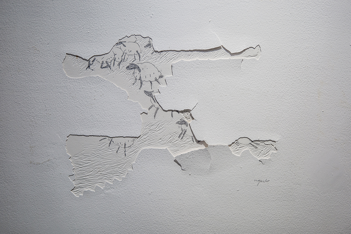- Một tác phẩm đặc biệt và thú vị khi phát hiện mảng tường bị bong tróc lớp tráng bên ngoài, Ngân dùng chì vẽ cừu núp ẩn phía sau tường, giống như hồi bé những đứa trẻ hay vẽ viết bậy lên tường. Bức này không có trong không gian chính của triển lãm, nó nằm đâu đó như một bí mật bất ngờ lúc mọi người check in – check out.