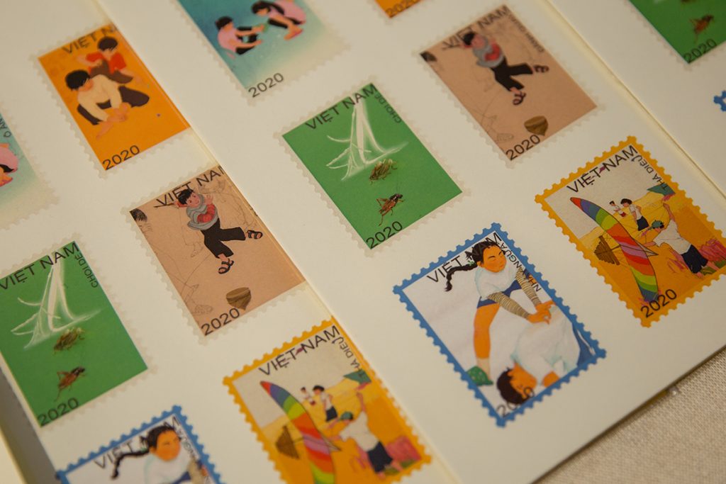 Với Ngân, chất liệu in ấn quyết định cảm xúc người xem rất nhiều, vì đây là tuổi thơ cùng những trò chơi dân gian dung dị, nên mình muốn mọi đường nét, màu sắc, và cả chất liệu đều phải hỗ trợ tối đa cho ý tưởng, thế nên, sau một thời gian tìm hiểu, giấy dó (*) là một lựa chọn không thể nào phù hợp hơn, đồ sờn trên bề mặt và màu trắng ngà đặc trưng sẽ mang lại cảm giác gần gũi, mộc mạc cho người xem.