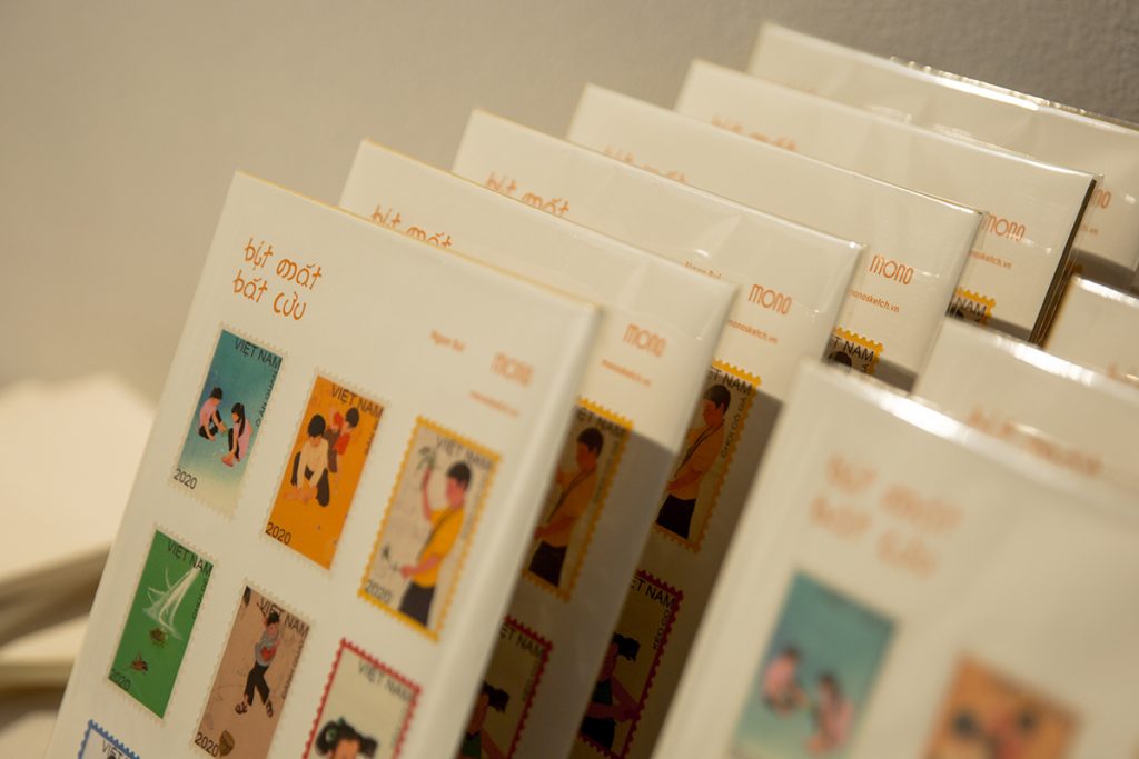 Để giữ cho người xem có được trải nghiệm gần gũi, đúng với tinh thần của buổi showcase, Ngân Bùi đã không ngần ngại dành ra khá nhiều thời gian để quyết định chất liệu in ấn cho tác phẩm của mình.