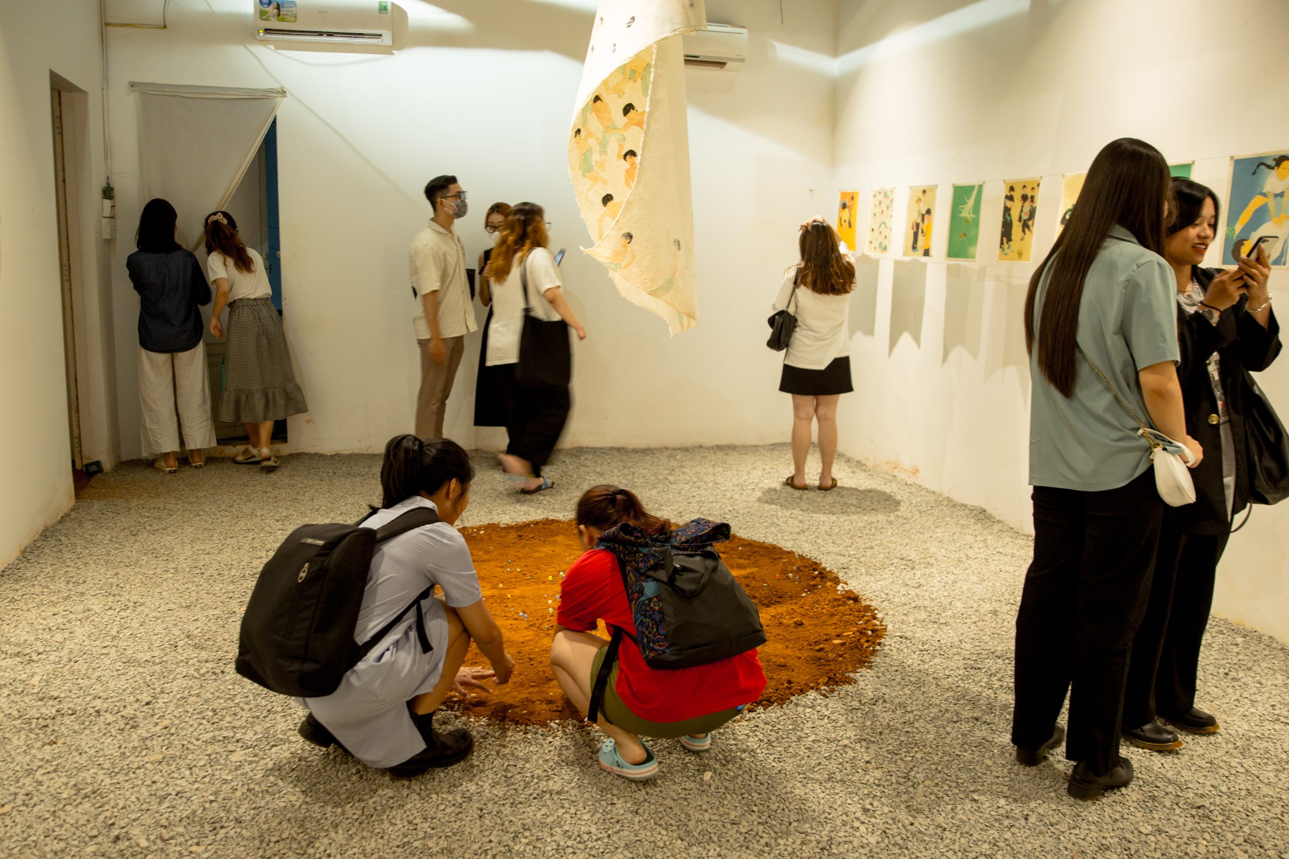 Mở đầu buổi ghé thăm showcase là chất giọng miền Bắc nhẹ nhàng của cô gái nhỏ Ngân Bùi hay còn gọi là Ngân Muôn Loài, yên bình dắt RGB đi vào không gian ngập tràn tiếng dế bao phủ lên tổng thể 18 bức hoạ xoay quanh chủ đề trò chơi dân gian thuở nhỏ, làm ta có cảm giác như đứng lại đâu đó giữa một bãi đất trống cạnh cánh đồng lúa hoặc bụi cỏ mọc dại ven đường làng trong một buổi xế chiều miền đồng quê, yên ả, mộc mạc như những dòng thơ, vè.