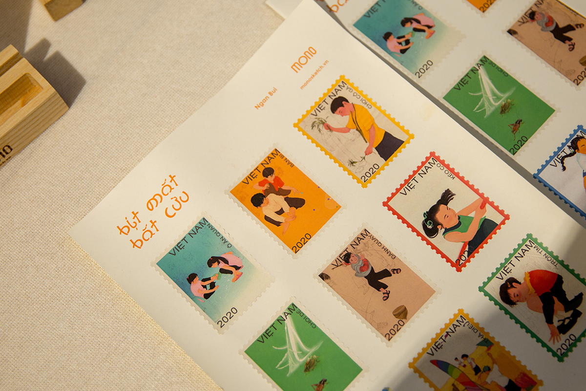 Với Ngân, chất liệu in ấn quyết định cảm xúc người xem rất nhiều, vì đây là tuổi thơ cùng những trò chơi dân gian dung dị, nên mình muốn mọi đường nét, màu sắc, và cả chất liệu đều phải hỗ trợ tối đa cho ý tưởng, thế nên, sau một thời gian tìm hiểu, giấy dó (*) là một lựa chọn không thể nào phù hợp hơn, đồ sờn trên bề mặt và màu trắng ngà đặc trưng sẽ mang lại cảm giác gần gũi, mộc mạc cho người xem.