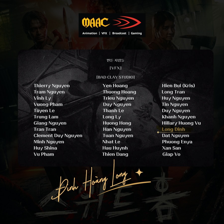 Bên cạnh đó, đội ngũ giảng viên dày dặn kinh nghiệm của MAAC cũng đã góp mặt vào không ít bom tấn Netflix xứ Hàn. Thầy Võ Huy Giáp (Giám đốc Đào tạo Học viện MAAC), thầy Nguyễn Hữu Tín (Giảng viên bộ môn LookDev/Lighting) hiện đang là CG Supervisor tại Bad Clay Studio và thầy Lê Nguyễn Quang Nhật (Giảng viên bộ môn Digital Painting) cùng tham gia dự án Sweet Home, The Devil Judge hay cô Nguyễn Thị Trà Giang (Giảng viên bộ môn Houdini) tham gia vào hàng loạt dự án nổi tiếng như Hellbound, Hotel Del Luna, Memories of Alhambra, Shanghai Fortress, Vagabond, Sweet Home,….