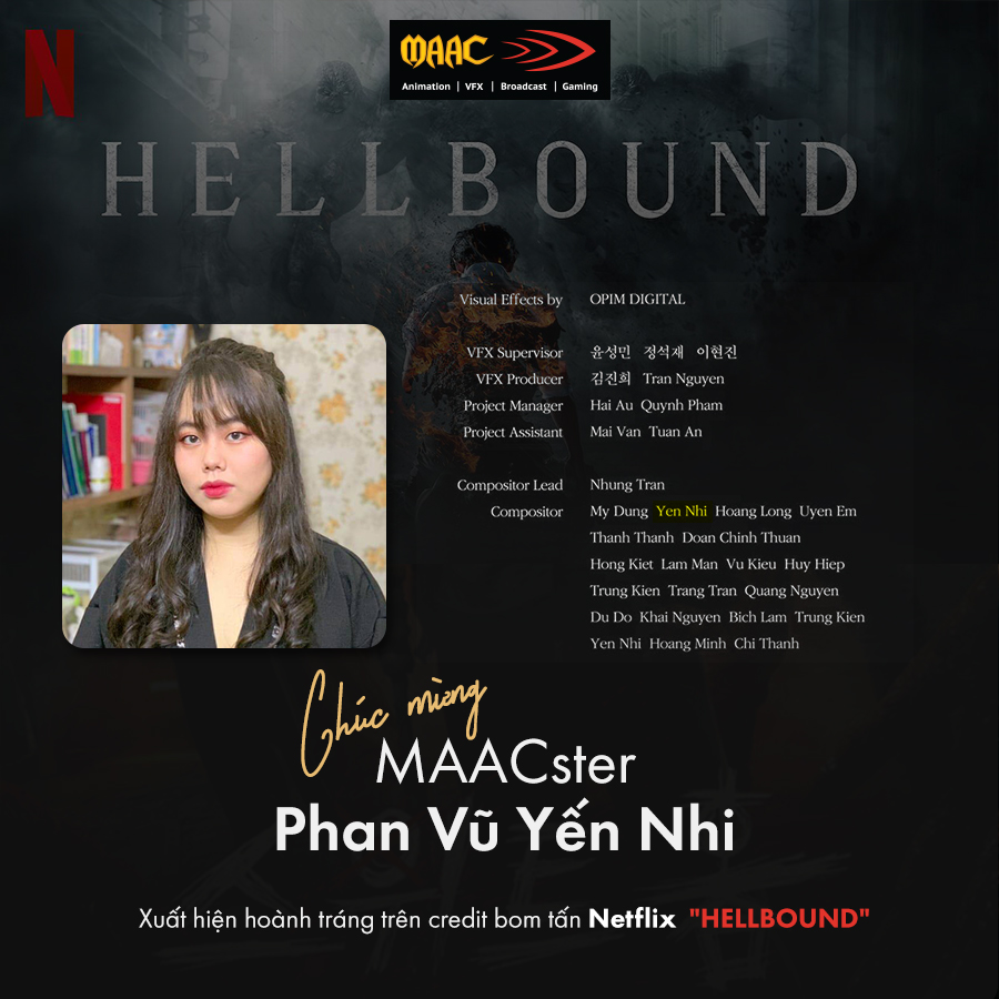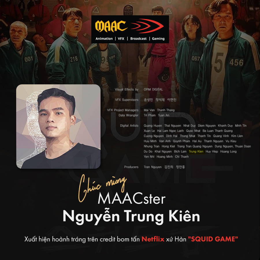 Không ít học viên chỉ sau gần một năm theo học tại MAAC đã có cơ hội gặp gỡ, kết nối với những Studio trong ngành và tham gia vào nhiều dự án Netflix đình đám. Bạn Đinh Hoàng Long (Học viên khóa VFX) hiện đang là Compositor & VFX Editor tại Bad Clay Studio, không chỉ tham gia Sweet Home, Đinh Hoàng Long còn tham gia làm compositing cho phim The Devil Judge (Thẩm Phán Ác Ma) của Hàn Quốc. Bạn Nguyễn Trung Kiên và Phan Vũ Yến Nhi (Học viên khóa VFX) khi chỉ mới bước vào HKII đã lọt vào mắt xanh của OPIM Digital – Studio chuyên thực hiện kỹ xảo cho các dự án phim Hàn Quốc. Hai bạn tham gia vào vị trí Digital Art trong phim Squid Game và mới đây nhất Yến Nhi tham gia vị trí Compositor phim Hellbound.