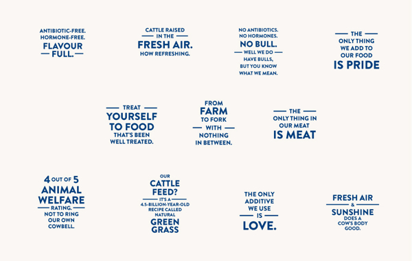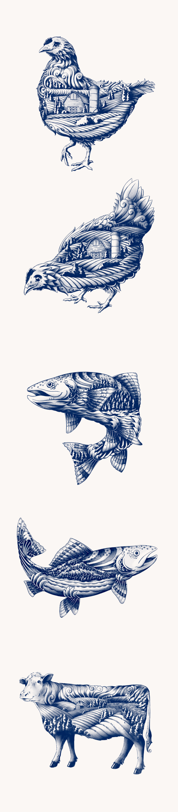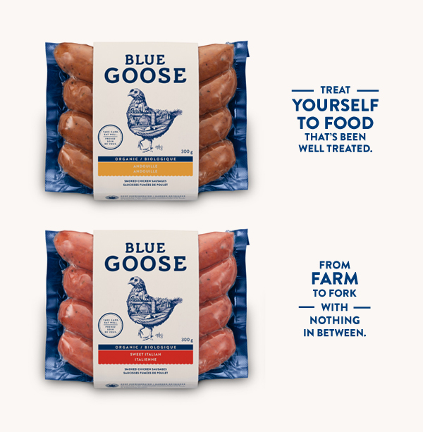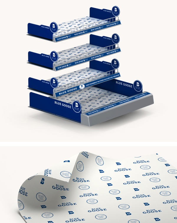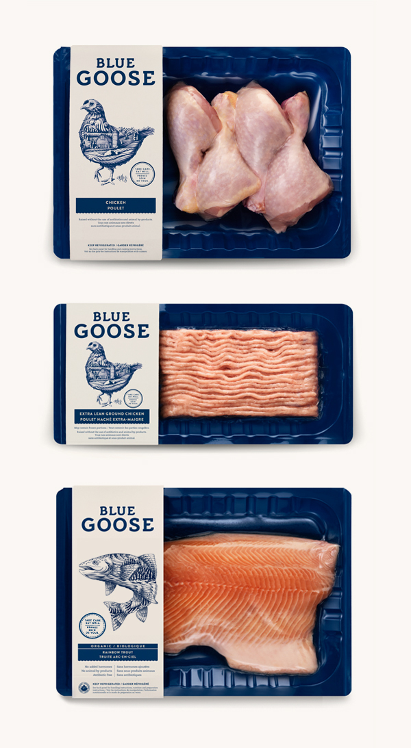 Blue Goose – một nhãn hàng thực phẩm xanh và sạch đến từ Canada. Họ hiện đang sản xuất thịt bò hữu cơ và tự nhiên, thịt gà và cá cho thị trường Canada. Trong việc phát triển bản sắc, Blue Goose đã làm việc với họa sĩ thiết kế Ben Kwok từ Los Angeles để phát triển hình ảnh minh họa cho bò, thịt gà và cá,và áp dụng chúng vào các bao bì.