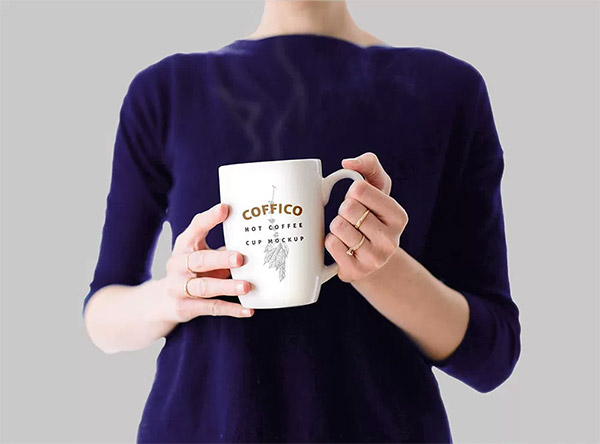 Đây là một mockup thực tế của một tách cà phê trên tay người phụ nữ.