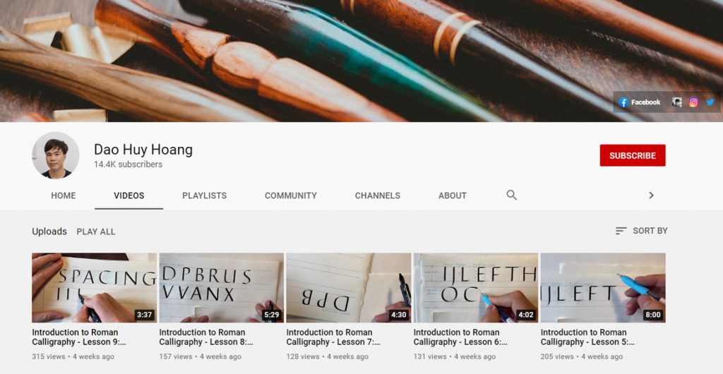 Kênh của nghệ sĩ Đào Huy Hoàng chuyên về Calligraphy, Lettering. Kênh Youtube này chia sẻ nhiều kiến thức về chữ và bút vẽ.