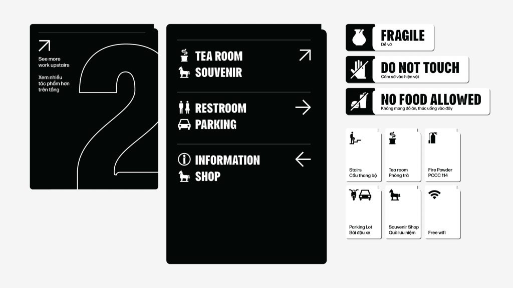 Hệ thống hình họa thương hiệu được thiết kế đơn giản nhưng đa dạng nhằm tương phản một cách bổ trợ với vẻ đẹp của các tác phẩm cùng với qui luật hình ảnh tác phẩm trở nên trung thực nhất có thể. Sử dụng phong cách thiết kế silhouette tạo ra điểm nhấn riêng cho các nút bấm và mẫu mã trên các ứng dụng khác nhau. Phương pháp thiết kế này liên kết với hệ thống lưới lấy cảm hứng từ bố cục ba phần của mặt bằng bảo tàng, đảm bảo sự nhất quán, đa dạng và đương đại trong hệ thống thương hiệu.